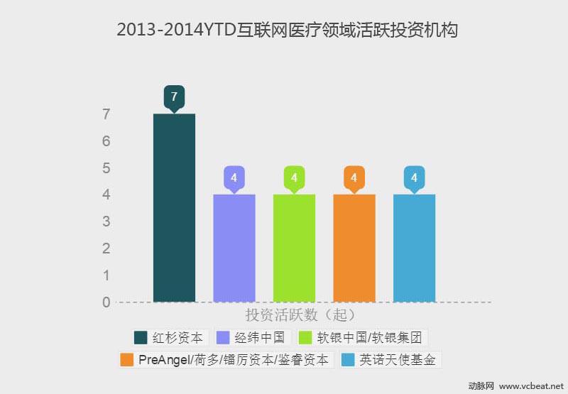 国内互联网医疗投资活跃机构 在2013-2014YTD期间,在互联网医疗领域活跃度高的主要有红杉资本、经纬中国、软银集团、PreAngel、英诺天使基金。