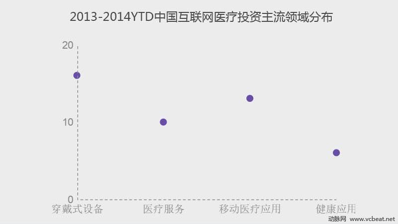 2013-2014YTD国内互联网医疗大型投资案接二连三 自2014年后,几乎每隔两月,投资机构就向互联网医疗挥进大笔资金,大型投资主要趋向已渐成熟的企业,并集中在C轮,其中腾讯基金连续两月在互联网医疗领域豪掷1.7亿美元。 从投资项目分布上,共有58起项目,主流项目主要有四个种类:穿戴式设备类获得投资的共计16个项目,医疗服务类获得投资的共计10个项目,移动医疗应用类获得投资的共计13个项目,健康应用项目类获得投资的共计6个项目。