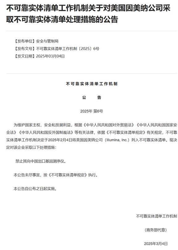 3月4日下午,中国商务部发布公告,决定对美国因美纳公司采取以下处理措施:“禁止其向中国出口基因测序仪。” 该项决定一经公布就引起了新闻媒体的广泛传播,和业内人士的热烈讨论。我们在此前2月4日美国因美纳公司被列入不可靠实体清单伊始就对该公司后续可能面临的处理措施以及其可能面临的巨大合规风险进行了提示,并建议广大中国企业尽早切断同其的合作以免受到牵连。(中国企业需警惕因美纳纳入不可靠清单后的巨大合规风险) 此次商务部公布的第一阶段处理措施同我们的估计完全一致,同时,我们认为还可以解读出如下几点: 1. 针对因美纳公司的处理措施已开始落地; 2. 此次针对因美纳公司的处理措施仅仅是第一批; 3. 针对因美纳公司的处罚已经上升为国家安全问题,后续处罚不存在转圜空间。 随着中美之间谈判裂痕越来越大,中美之间脱钩的趋势越来越明确,我们希望再次提示处于该行业的中国企业,放弃继续维持同因美纳公司合作的幻想,因美纳公司退出中国市场只是时间问题。中国企业应尽早完成国产化替代。 1 针对因美纳公司的处理措施已开始落地 根据我们过往处理不可靠实体清单的经验,以及商务部相关公告的行文,针对因美纳公司的处理措施将在商务部公告后即告生效,不会设置过渡期。同时,就本次处理措施的涵盖范围,我们认为应做如下理解: 1. 禁止的范围除了明确表述的基因测序仪外还包括试剂耗材和零部件 对于此次被禁止进口的因美纳公司产品范围目前在网络上引发了激烈的讨论,从我们专业角度看,此次商务部的反制目标已经非常明确,意在全面限制因美纳公司在华业务,我们认为此次禁止的范围至少将包括如下产品: 基因测序仪的整机进口(包括在华组装产品) 这将包括所有型号的测序仪整机(如NovaSeq系列、NextSeq系列、iSeq系列等),无论其申报海关品名是否为“基因测序仪”(例如申报为“实验室分析设备”但实质用途为基因测序的,仍被禁止)。 同时即使因美纳将零部件运至中国境内工厂(如保税区内)进行组装,并标注“中国制造”,只要技术来源或品牌归属为因美纳,仍视为原厂产品,禁止销售。 通过采购零部件在华组装贴牌的OEM产品 我们认为通过采购零部件在华组装贴牌的OEM产品也将落入此次的禁令,包括国内企业购买因美纳核心模块(如光学系统、微流控芯片)后自行组装,并更换品牌标签(如标注为本土品牌X的测序仪)。根据出口管制的成分或直接技术规则,只要因美纳技术占比超过整机价值的一定比例,仍应视为变相进口。 试剂进口 我们认为即使是此前采购的整机,在后续购买试剂时也将面临重重困难。此次禁令预计包括所有与测序仪配套的消耗品,即各类试剂。 从监管逻辑来看,企业在开展进口申报时,若商品编码(HS Code)涉及“基因测序设备及零件”将触发系统自动拦截,需人工提交技术参数证明。若企业进口时将试剂包装更名为“生物反应液”或“实验室通用缓冲剂”,但实际用途为测序配套的,监管部门将按实质用途判定违规。 2. 商务部开展禁止措施的考量是保障我国在基因测序领域的国家安全 作为占据全球基因测序设备市场83.9%份额的绝对龙头,因美纳在华业务覆盖医疗诊断、农业育种等关键领域,但其技术霸权逐渐演变为战略威胁。2023年曝光的20万份中国公民基因数据违规跨境传输事件,暴露出生物安全风险;而通过中断设备供应、强制捆绑试剂销售等手段挤压中国企业生存空间,则直接违反市场公平原则。 考虑到因美纳公司在华销售的设备可精确解析族群遗传特征,其开展的生物信息采集可能直接到威胁国家安全,这类战略性数据的失控可能影响人口健康管理、疾病防控等国家核心利益。这与美国《生物安全法案》试图遏制中国生物科技企业的动作形成直接对冲。此次商务部对因美纳公司的处理措施标志着中国在高科技领域对技术垄断与数据安全威胁的系统性反制。这场制裁背后,是生物科技产业链主导权争夺、数据主权规则重构,以及全球供应链格局重塑的深层博弈。 2 此次针对因美纳公司的处理措施仅仅是第一批 除了在公告中明确禁止因美纳公司向中国出口基因测序仪外,商务部的公告中再次提到了“本公告未尽事宜,按《不可靠实体清单规定》执行。”。这意味着此次针对因美纳公司的处理措施仅仅是第一批处理措施,后续还将根据因美纳公司的具体情况进一步推出更多的处理措施。(需强调,不论是哪一种处理措施,都将直接颠覆因美纳公司整个在华业务,并直接牵连到因美纳母公司及通常情况下其控股超过50%的关联公司)根据《不可靠实体清单规定》第十条,其可能包括: 1. 禁止中国境内投资 禁止在中国境内投资的规定,将限制因美纳公司进一步拓展和加深在华业务的能力。企业在中国的投资通常用于建设生产基地、研发中心或市场拓展项目,一旦失去这一渠道,其在华市场的扩张和本土化进程将受到极大制约。这种限制不仅使公司未来在中国市场中的竞争力下降,还会削弱其对中国市场机会的把控和资源整合能力。 甚至,若从重执法,因美纳公司既有的在华投资也可能被勒令取消,并限期要求清退资产离境,届时整个因美纳公司在华存在都可能覆灭。 设想若因美纳公司计划在华设立一个高科技研发中心,原本打算大举投资以扩大市场份额。然而,就在项目准备启动之