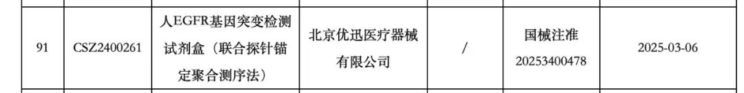 2025年3月6日,人EGFR基因突变检测试剂盒(联合探针锚定聚合测序法)获批。