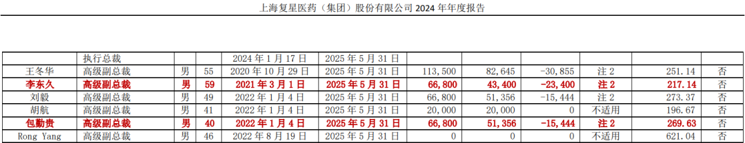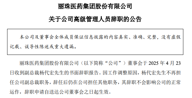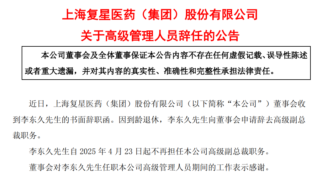 4月23日,丽珠医药发布公告,称收到副总裁杨代宏先生的书面辞职报告。因工作调整原因,杨代宏先生不再担任公司副总裁职务,辞任后仍在公司担任其他职务。 截至公告日,杨代宏先生持有公司A股股票516979股。 杨代宏先生毕业于中国药科大学,1997年加入丽珠医药,1999年至2009年期间,先后任丽珠集团丽珠制药厂副厂长、厂长,2014年10月至2017年6月担任执行董事,自2006年5月起担任丽珠集团副总裁。 复星医药高级副总裁李东久辞职! 同一天(4月23日),复星医药发布《关于公司高级管理人员辞职的公告》。 近日,上海复星医药(集团)股份有限公司(以下简称“本公司”)董事会收到李东久先生的书面辞职函。因到龄退休,李东久先生向董事会申请辞去高级副总裁职务。 李东久先生自2025年4月23日起不再担任本公司高级副总裁职务。 董事会对李东久先生任职本公司高级管理人员期间的工作表示感谢。 2024年,高级副总裁李东久年薪为217.14万元。 据复星医药年报介绍,李东久先生于2009年12月至2018年1月曾历任本公司副总裁、高级副总裁等职,并于2021年3月重新加入本集团。李东久先生现任联交所上市公司国药控股非执行董事。首次加入本集团前,李东久先生曾任职于上证所上市公司华北制药股份有限公司副总经理兼财务负责人。李东久先生曾任联交所上市公司国药控股副总裁、总法律顾问、深交所上市公司国药集团一致药业股份有限公司董事。 3月31日,丽珠集团收到副总裁杨亮先生的书面辞职报告。因个人发展原因,杨亮申请辞去公司副总裁及子公司担任的一切职务,辞任后将不在公司及子公司任职。 杨亮历任珠海威丝曼战略推进主管及投资并购经理,中集集团战略绩效主管。2011年加入丽珠集团,历任高级投资经理,董事会秘书、公司秘书兼授权代表等职位。 3月31日,复星医药发布公告称,因个人原因,包勤贵先生向董事会申请辞去高级副总裁职务。 据复星医药年报介绍,包勤贵任公司高级副总裁、曾任医学诊断事业部董事长。包先生于2010年7月加入本集团,曾任控股子公司复星健康总裁助理、副总裁、执行总裁等职,亦于2020年1月至2022年1月任本公司副总裁。 |