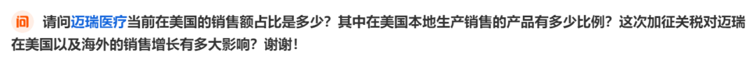 迈瑞医疗4月23日在投资者关系平台上答复了投资者关心的问题。 投资者提问:公司之前回复了美国对中国加征关税对贵公司今年的美国业务没有影响,那请问中国对美国加征反制关税可能会对公司的成本带来哪些影响? 迈瑞医疗:公司目前有部分原材料是从美国进口的,正在积极采取应对措施,包括但不限于原材料替代等,公司有信心确保原材料的供应安全。中国对美国加征反制关税将不可避免地对今年的利润率造成一定影响。不过,公司认为反制关税对今年利润的影响是一次性的,通过积极应对,未来公司有信心实现利润率水平回升。 4月3日,迈瑞医疗在投资者关系互动平台上也回应了关税对公司的影响情况。 迈瑞医疗表示,长期以来,公司密切关注美国对华关税政策,积极研讨并实施应对方案。在今年初美国对中国商品加征两次10%关税生效前,公司已提前根据意向订单在美国前瞻备货,因此今年美国销售的产品并不受到本轮关税影响。为满足国际化业务运营需求,公司在全球布局了几十家生产基地,其中包括已获FDA认证的工厂,可满足包括美国在内的全球市场需求。 迈瑞医疗表示,自2018年中美贸易战以来,公司销往美国的产品便被加征关税,但这并未影响公司美国市场的拓展。2018年至2023年美国业务的复合增速达到了10%,目前美国销售收入占总收入比重约6%。 “随着公司高端产品占比持续提升,美国市场的盈利能力自2018年以来也在不断提升,目前美国业务的毛利率水平已经超过了70%,利润率也已超过加征关税前的水平。值得一提的是,超高端超声Resona A20预计今年可获批FDA注册,该产品的ASP(平均价格)比上一代超声产品高出一倍。”迈瑞医疗说,展望未来,占公司海外收入三分之二的发展中国家市场依旧是公司的增长引擎,公司将继续在美国市场打磨品牌和技术,以此提升公司产品在发展中国家的影响力,保障发展中国家未来长期的快速增长。 迈瑞医疗主要产品覆盖三大领域:生命信息与支持、体外诊断以及医学影像,2024年前三季度,公司实现营业收入294.85亿元,同比增长7.99%,分区域来看,受益于海外高端战略客户和中大样本量实验室的持续突破,以及动物医疗、微创外科、AED(自动体外除颤器)等种子业务的放量,国际市场前三季度增长超过18%,其中欧洲和亚太市场增长均超过了30%。 |
