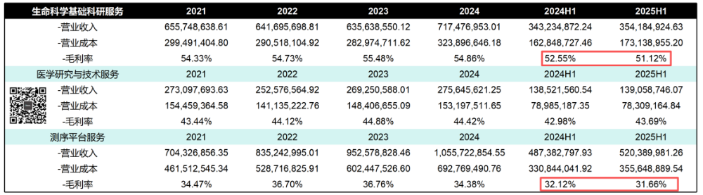 | 还是继续咱们的财报闲聊,再强调下,国内季报和半年报结构差距太大,有些数据不可比。诺禾致源2025H1营收10.40亿元,同比增长4.36%。归属上市股东净利润7872.96万元,同比增长1.03%。扣非净利润6293.48万元,同比下滑4.52%。2025Q2虽然营收达到5.38亿元,同比增长1.87%。但是,归属上市股东利润下降到4485.40万元,同比下滑11.38%。好在,扣非后几乎与去年持平,达到4084.02万元,略微下滑1.95%。这可能与诺禾毛利率下滑有关,去年同期主营业务毛利率大概是41.71%,今年则为40.82%。根据公开的财报信息,生命科学基础科研服务毛利率51.12%,相较于去年同期下滑了1个百分点。营收占比过半的测序平台业务毛利率也略微下滑,达到31.66%,相较于去年下滑0.5个百分点左右。当然,这在今年已经算优秀了...可以参考咱们前两天的万孚、迪安...诺禾致源海外营收已经从我们2021年跟踪的占比35.72%提升到了2025H1的51.28%!根据公司的研发人员数量和占比反推了下员工数量,与2024年相比几乎没什么太大变化,还是稳的。另外,蒋智老师继2024年增持16万股后再次选择减持523.21万股诺禾股票。目前,持股数量已经降至343.06万股,再来一次就差不多清仓了。特别想知道这个员工1是怎么能批出来50万备用金的...