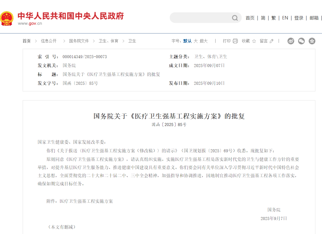 9月10日,国务院发布关于《医疗卫生强基工程实施方案》的批复,国函〔2025〕85号。此次方案,公布了关于医疗卫生强基工程的12大条措施。 为深入贯彻落实党中央、国务院决策部署,实施医疗卫生强基工程,让群众获得公平可及、系统连续、优质高效的医疗卫生服务,制定本方案。以习近平新时代中国特色社会主义思想为指导,全面贯彻党的二十大和二十届二中、三中全会精神,深入学习贯彻习近平总书记关于健康中国建设的重要论述精神,落实新时代党的卫生与健康工作方针,坚持以基层为重点,着力强基层、固基础、保基本,织牢基层网底,改善基础服务条件,优化保障基本服务,加快推动从以治病为中心向以人民健康为中心转变,不断增强人民群众健康获得感、幸福感、安全感。到2027年,基层医疗卫生机构布局更加合理,设施条件进一步改善,基本公共卫生服务能力和基本医疗服务能力持续提升,力争居民15分钟可达最近的医疗服务点。到2030年,基层医疗卫生服务体系进一步健全,人才队伍持续发展壮大,设施设备条件和数智化水平显著改善,基本公共卫生服务均等化和基本医疗服务均质化水平明显提升,县级及以下医疗卫生机构服务量占比持续提高,中西医协调发展迈向更高水平,分级诊疗体系建设取得显著成效,群众就近就便享有优质高效的健康服务。(一)优化基层医疗卫生机构规划布局。健全以县级医院为龙头、乡镇卫生院为枢纽、村卫生室为基础的乡村医疗卫生服务体系,进一步加强城市社区卫生服务体系建设。结合人口变化趋势优化乡镇卫生院、村卫生室和社区卫生服务中心(站)设置。推进乡村医疗卫生机构一体化管理,创造条件逐步将符合条件的公办村卫生室转为乡镇卫生院延伸举办的村级医疗服务点。因地制宜发展“固定+流动”的医疗卫生服务供给模式,全面建立国家、省、市、县、乡五级巡回医疗制度,实现巡回医疗在医疗资源薄弱县全覆盖。完善县区医疗急救体系,改善装备条件,提升重症和危重症患者急救、转运能力,畅通急救服务绿色通道。提升基层突发事件医疗应急能力,到2030年实现每个县区组建并强化1支背囊化医疗应急小分队。完善血液供需联动保障机制,增设采血点,构建高效、安全的血液供应保障体系。(二)落实基层医疗卫生机构功能定位。县级医院主要提供县区内常见病、多发病、慢性病诊疗护理和危急重症救治、疑难复杂疾病向上转诊等服务及承担相应公共卫生功能。乡镇卫生院、社区卫生服务中心负责提供基本公共卫生服务,以及为初诊患者、普通常见病和多发病患者、诊断明确且病情稳定的慢性病患者等提供服务。村卫生室、社区卫生服务站承担行政村、社区范围内人群的基本公共卫生服务和普通常见病、多发病的初级诊治、康复等工作。强化县区内医疗卫生机构之间以纵向为主的协同、帮扶、合作,围绕基层定位,面向基层急需,健全基层功能,提升基层能力。(三)加强紧密型医联体内涵建设。依托紧密型医联体(包括紧密型城市医疗集团、紧密型县域医共体),推动以人员为核心的资源下沉基层,基本实现每个乡镇卫生院、社区卫生服务中心均有县级及以上医疗卫生机构中高级职称医师派驻。推动紧密型城市医疗集团建设试点提质扩面,构建“以市带区、区社一体”协作模式。到2027年紧密型县域医共体基本实现县和县级市全覆盖,到2030年县域医共体紧密性、协同性进一步提升。推进紧密型县域医共体胸痛、卒中、创伤、危重孕产妇救治、危重新生儿和儿童救治等中心以及专科临床服务中心建设。在紧密型县域医共体内进一步推广“分布式检查、集中式诊断”。统筹紧密型县域医共体现有资源,建立人力资源、财务、医疗质控、医保、信息数据等管理中心,促进医共体内服务均质化。推进检查检验结果互认。(四)实施基本公共卫生服务普惠行动。持续优化基本公共卫生服务项目,充实内容、量化频次。加强城乡居民健康教育。强化孕产妇、0—6岁儿童、65岁以上老年人以及高血压、2型糖尿病、慢阻肺病患者等重点人群系统连续服务,加强基层多病共防、多病共管和医防融合,到2030年高血压、2型糖尿病患者基层规范管理服务率达到70%以上。加强严重精神障碍患者和肺结核患者随访管理。强化突发公共卫生事件报告和处理、职业病和地方病防治等基本公共卫生服务。引导规范社会办医疗卫生机构参与承接政府购买基本公共卫生服务。(五)开展基本医疗服务提升行动。通过学科和能力建设、对口帮扶等多种方式,发展县级医疗卫生机构全科、感染、麻醉、病理、白内障手术、血液透析、精神卫生等服务,到2030年常住人口5万以上的县区普遍具备开展白内障手术、血液透析能力。持续开展“优质服务基层行”活动,加强乡镇卫生院、社区卫生服务中心特色科室建设,到2030年乡镇卫生院、社区卫生服务中心达到服务能力标准的比例保持在95%以上。强化村卫生室基本医疗服务功能。持续推进家庭医生签约服务高质量发展,一般人群覆盖率每年提升1至3个百分点,不断提高签约群众满意率。推动二、三级公立医院预留部分号源优先向本地区基层医疗卫生机构开放。通过政府购买服务等方式引导优质医疗服务下沉基层。完善接续性服务体系,大力发展康复、护理、安宁疗护等服务。健全县乡村用药衔接联