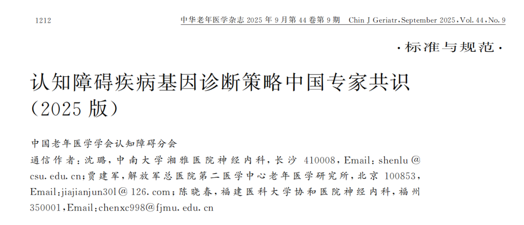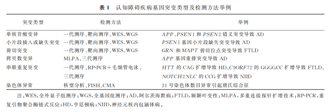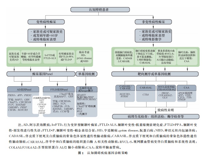 【摘要】 遗传相关的认知障碍疾病种类繁多、遗传方式多样、突变类型复杂,目前针对该类疾病基因变异的分类和解读,以及规范化的基因诊断流程缺乏系统性共识,为规范基因检测在认知障碍疾病诊断中的应用,本共识围绕常见遗传相关认知障碍疾病的致病基因检测方法的选择、突变位点致病性解读、基因型-表型的关系等方面,参照国际指南共识、当前研究进展以及国内专家意见制定了针对中国人群遗传性认知障碍相关疾病的基因诊断流程,以便在临床工作中应用。 【关键词】 认知障碍;遗传学;表型;诊断 一、概述 认知障碍疾病是一类涉及记忆、语言、注意、执行功能和视空间功能等一个或多个认知域受损,并导至患者日常生活和工作能力减退及精神行为异常的综合征,由遗传、环境和老化等因素共同作用引起[1]。遗传相关的认知障碍疾病种类较多,根据遗传方式不同,可分为染色体病、单基因遗传病、多基因遗传病和线粒体遗传病。(1)染色体病如21三体(唐氏)综合征等;(2)单基因遗传病包括:①常染色体显性遗传病,如亨廷顿病(Huntington's disease,HD)、神经元核内包涵体病(neuronal intranuclear inclusion disease,NIID)等;②常染色体隐性遗传病,如伴皮质下梗死和白质脑病的常染色体隐性遗传性脑动脉病(cerebral autosomal recessive arteriopathy with subcortical infarcts and leukoencephalopathy,CARASIL)等;③X-连锁显性遗传病,如脆性X综合征等;④X-连锁隐性遗传病,如法布里病(Fabry disease)等;(3)多基因遗传病,如阿尔茨海默病(Alzheimers disease,AD)等;(4)线粒体遗传病,如线粒体脑肌病伴高乳酸血症和卒中样发作(mitochondrial encephalomyopathy with lactic acidosis and stroke-like episodes,MELAS)等。遗传因素在不同认知障碍疾病中的贡献度不同,其中染色体病、单基因遗传病和线粒体遗传病主要由遗传因素所致,而多基因遗传病可由遗传和环境因素等共同作用引起[2]。 基因检测技术包括一代测序(又称Sanger测序)、二代测序(包括靶向测序、全外显子组测序和全基因组测序)、三代测序(又称长读长测序)、多重连接探针扩增技术(multiplex ligation-dependent probe amplification,MLPA)和重复引物聚合酶链式反应(repeat-primed polymerase chain reaction,RP-PCR)等[3]。基因突变的类型包括单核苷酸变异、小片段插入或缺失突变(1~50 bp)、剪切突变、拷贝数变异、串联重复突变和染色体异常等[4],不同认知障碍疾病根据其携带的致病基因突变类型,选择基因检测方法也存在差异,见表1。基因检测不仅有助于遗传相关认知障碍疾病患者的精准诊断,而且可为临床用药选择和未来的基因治疗提供指导。然而,由于认知障碍疾病临床表型复杂,且存在遗传异质性,加之基因检测技术的多样性、变异结果解读标准不一致等原因,临床医生在认知障碍疾病基因诊断的临床实践中仍存在诸多困惑。 本共识由中国老年医学学会认知障碍分会牵头,共组织31名神经内科、老年医学科、精神科等长期从事认知障碍疾病诊治工作的临床专家撰写。共识的主体章节部分按照疾病分类进行临床和致病基因概述,并围绕疾病的遗传学特征提出相应的推荐意见。撰写人员通过对PubMed、Web of Science、Cochrane Library等英文数据库以及中国知网、万方医学、中国科技期刊全文数据库等中文数据库进行检索和对相关文献系统分析,英文检索的关键词为“cognitive impairment”“dementia”“genetics”“genetic diagnosis”“genetic testing”“genetic therapy”“Alzheimer's disease”“Frontotemporal lobar degeneration”“Frontotemporal dementia”“Prion disease”“Creutzfeldt-Jakob disease”“Huntington disease”“Neuronal intranuclear inclusion disease”“Vascular cognitive impairment”等;中文检索的关键词包括“认知障碍”“痴呆”“遗传学”“基因诊断”“基因检测”“基因治疗”“阿尔茨海默病”“额颞叶变性”“额颞叶痴呆”“朊蛋白病”“克-雅病”“亨廷顿病”“神经元核内包涵体病”“血管性认知障碍”等。文献纳入标准包括标准随机对照研究、非随机观察性研究、临床病例或队列研究、荟萃分析、诊治指南、专家共识等,文献检索截止日期为2024年7月31日。本共识采用共识形成会议法,于2024年7月形成共识第一版并提交撰写专家组审核;随后在2024年9月形成第二版,由撰写专家组和审核组专家审核;最后在2024年11月形成共识最终版并获得全体编写委员会专家的审核通过。本共识在深入分析认知障碍疾病基因型-表型复杂性的基础上,提出了中国认知障碍疾病基因诊断策略的推荐意见,供神经内科、老年医学科、精神科、医学遗传学科等临床医生和生物信息分析人员使用。 二、常见遗传相关认知障碍疾病的基因诊断思路 (一)AD AD是最常见的痴呆类型,占所有痴呆类型的60%~80%,临床表现以情景记忆障碍为主,伴有语言、视空间、执行功能障碍以及精神行为症状等,影响日常生活和工作能力[5]。根据发病年龄不同,AD可分为早发性AD(early-onset AD,EOAD)(发病年龄<65岁)和晚发性AD(late-onset AD,LOAD)(发病年龄≥65岁)。2011年美国国家衰老研究所和阿尔茨海默病协会(National Institute of Aging and the Alzheimers Association,NIA-AA)制定的AD诊断标准中提出了基因检测可作为早期诊断AD的重要手段之一[6]。 常染色体显性遗传AD(autosomal dominant AD,ADAD)多见于EOAD,发病年龄分布在40~60岁。常见的致病基因为早老素1(presenilin 1,PSEN1)基因(MIM:104311)、早老素2(presenilin 