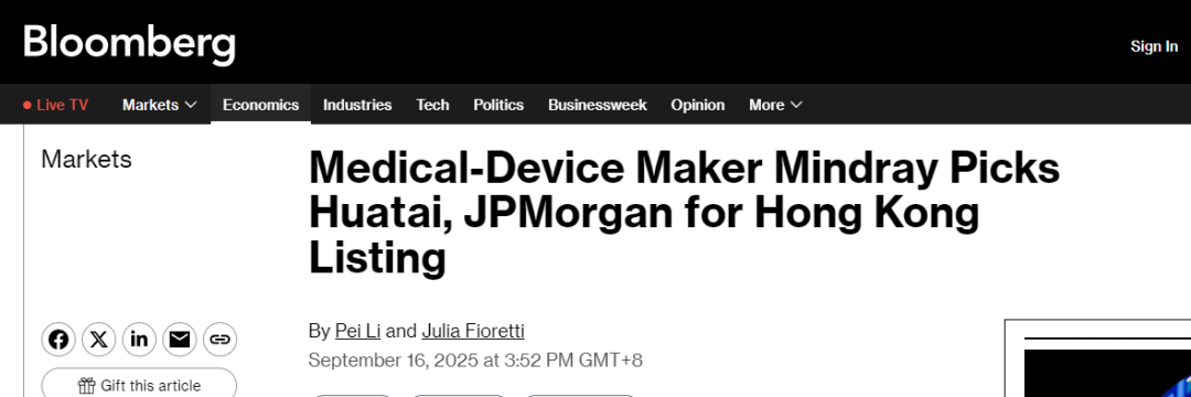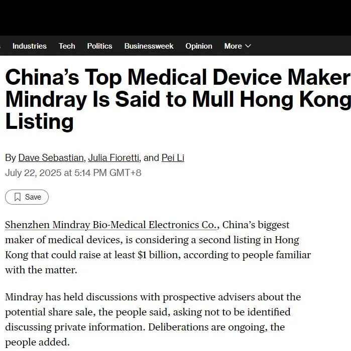 据彭博社近日报道,公司已正式启动筹备工作,并已选定华泰证券和摩根大通作为首批承销行,协助推进相关上市事宜。消息人士透露,未来迈瑞医疗可能视进展增加更多国际投行加入承销团队,以保障全球投资者覆盖面。 此前,7月22日,据彭博社报道消息,A股医疗器械龙头迈瑞医疗正与潜在顾问团队推进香港二次上市计划,预计募资规模不低于10亿美元(约合78亿港元)。