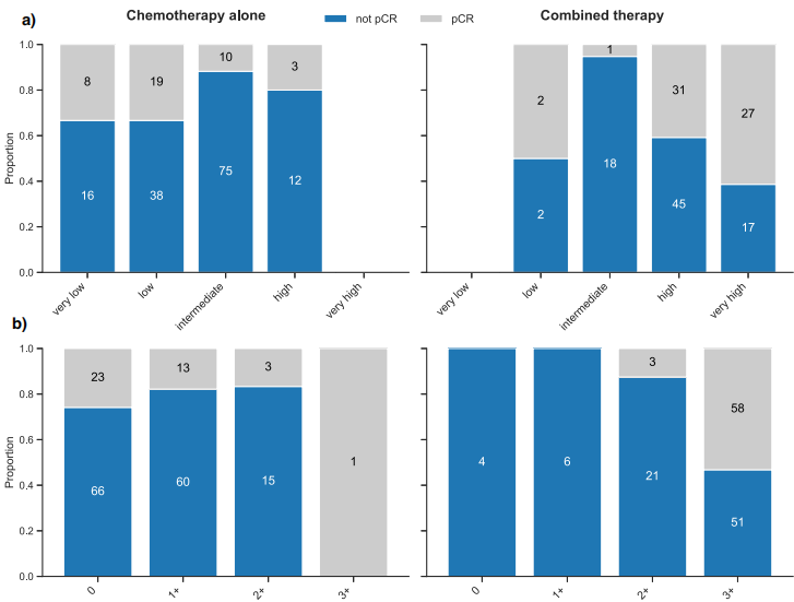 为了探究 ERBB2 表达类别是否会影响接受或未接受抗 HER2 治疗的患者样本对 NACT 的反应,作者比较了不同 ERBB2 mRNA 和 HER2 IHC 类别下的病理完全缓解(pCR)率,并根据是否接受抗 HER2 治疗进行分层(如下图)。由于只有IHC评分为2+(加上ISH阳性)或3+的患者才能获得靶向治疗,因此在治疗分配中存在固有的选择偏倚。结果显示,与IHC评分相比,pCR在ERBB2表达类别中的分布更为广泛,ERBB2表达水平与病理完全缓解率(pCR)显著相关(p<0.05),在归类为“ERBB2表达非常高”的组别中观察到的pCR比例最高。而IHC评分仅在高表达组(3+)显示明确关联。这表明,新辅助化疗可能对更多非 IHC 3+评分的患者有益。