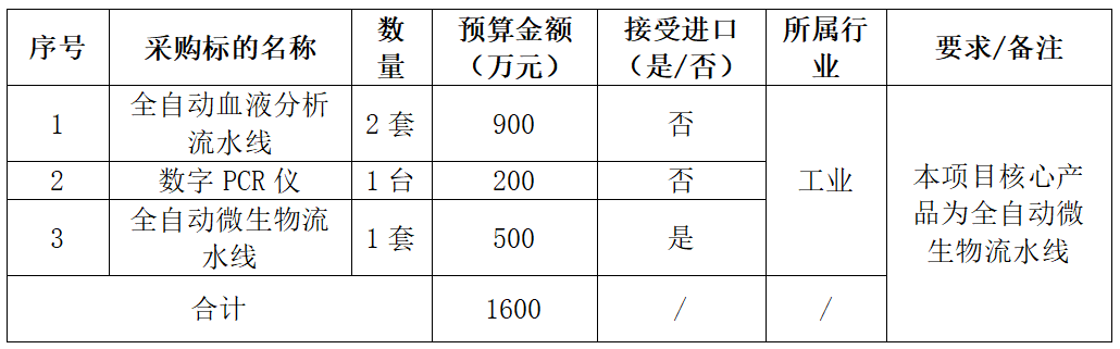 涉及2套全自动血液分析流水线、1台数字PCR仪、1套全自动微生物流水线。