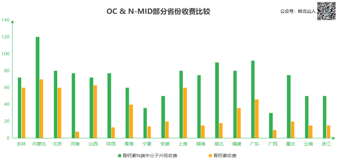 只有天津、江苏、贵州和江西四个省份没有收费,河南骨钙素N端中分子片段收费77,常规骨钙素收费8元,接近10倍;而陕西分别是77和13元,相差达到了6倍。