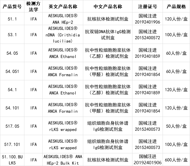 AESKU公司进入中国市场20余年,凭借过硬的产品质量与领先的研发能力,在临床检验领域树立了良好口碑。目前AESKU在华可提供间接免疫荧光(IFA)与酶联免疫(ELISA)两大产品线,尤其是其创新的全自动IFA设备及试剂系统广受行业认可。