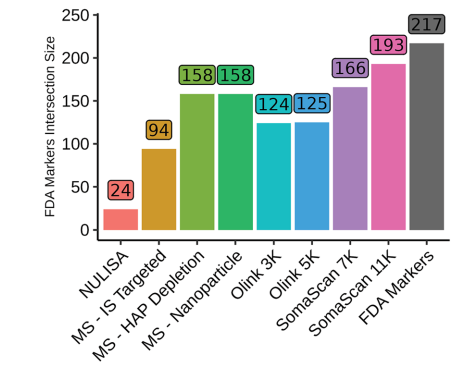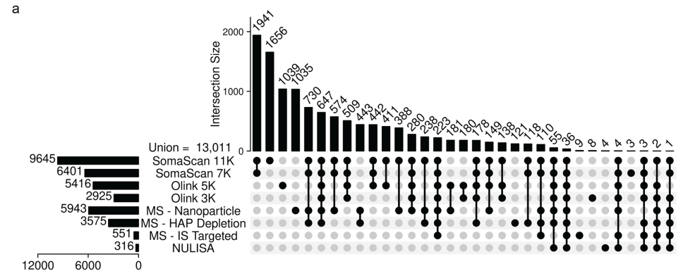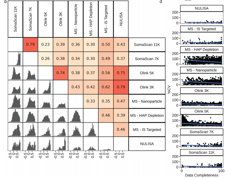 前言 血浆是包括蛋白质在内的生物分子的丰富来源,反映了健康和疾病。由于其在生物过程中的关键作用,蛋白质作为生物标志物具有巨大的潜力,近年来推动了血浆蛋白质组分析的兴起。然而,利用血浆蛋白质组作为生物标志物的来源存在一些挑战。血浆蛋白质组跨越很宽的动态范围,一些生物标志物的浓度很低,使它们的检测和精确定量复杂化。目前,用于分析血浆蛋白质组的两种主要方法是基于亲和力的技术和基于质谱(MS)的方法。然而,对不同血浆蛋白质组学平台性能目前还缺乏系统性比较。 近日,杂志communications chemistry上发表了一篇题为“Current landscape of plasma proteomics from technical innovations to biological insights and biomarker discovery”的文章。本研究通过八种基于亲和力和质谱的技术平台,对同一健康队列进行分析,旨在评估技术差异、互补性及其对生物标志物发现的启示。结果显示,每个蛋白质组学平台都具有独特和互补的优势。应根据研究目标,并权衡覆盖范围、准确性和发现潜力来选择血浆蛋白质组学平台。 图片来源:communications chemistry 主要内容 不同血浆蛋白质组学平台概述 目前,用于分析血浆蛋白质组的两种主要方法是基于亲和力的技术和基于质谱(MS)的方法。基于亲和力的平台,如SomaScan、Olink Explore和NULISA使用结合探针(适体或抗体)来检测蛋白质。质谱方法通常测量蛋白质的蛋白水解肽来获得蛋白质水平的信息。为了应对动态范围的挑战,质谱工作流程可能包括高丰度蛋白质耗尽、肽预分离、蛋白质沉淀、基于离子迁移率的分离、或通过微球或纳米颗粒进行蛋白质富集。 每种方法有其独特的优点和缺点。基于亲和力的技术,比如SomaLogic和Olink利用大型靶向检测面板检测预先选择的蛋白质,可进行高通量测量以及多重检测。然而,特异性取决于许多因素,如结合表位的唯一性、探针的亲和力等。相比之下,基于MS的蛋白质组学可以通过非靶向或靶向方法进行,并且能够识别蛋白质的翻译后修饰(PTMs)和同工型。然而,检测深度有限,难以用于低丰度血浆蛋白。基于纳米颗粒的富集方法,如最近推出的Seer Proteograph™XT,增加可溶性蛋白质组的覆盖率。还有其他富集策略包括perCA耗尽等创新方法可检测低丰度血浆蛋白。 研究队列和蛋白质组学平台概述。图片来源:communications chemistry 技术平台比较 本研究比较了八种蛋白组学技术平台,包括SomaScan 11K/7K、Olink 5K/3K、NULISA、MS-Nanoparticle、MS-HAP Depletion、MS-IS Targeted。结果显示,SomaScan 11K检测到最多蛋白质(9,645种),其次是SomaScan 7K(6,401种)和纳米颗粒质谱(5,943种)。在所有8个平台中,仅有36种蛋白质重叠(下图a)。 精确性角度而言,SomaScan技术变异系数(CV)最低(中位数5.3%-5.8%),Olink 5K/3K CV较高(26.8%,11.4%),但通过信号过滤后可改善。基于MS的平台CV较高, MS-Nanoparticle的中位CV为26.4%,MS-HAP Depletion的中位CV为29.8%,MS-IS Targeted的中位CV为8.3%。 数据完整性角度而言,SomaScan 11K/7K达95%以上,Olink 3K/5K为60.3%和35.9%,质谱平台约53%-60%。 蛋白质定量和检测指标的跨平台比较。图片来源:communications chemistry 技术平台的临床效用评估 作者比较了不同平台对FDA批准的人类血浆217种已知蛋白质生物标志物的覆盖范围。结果显示(如下图),SomaScan 11K覆盖了其中的88%,质谱平台覆盖了73%,Olink 覆盖了57%。MS-IS Targeted的覆盖率较低,为43%。 但需要注意的是,纳米颗粒富集法导至血小板标志物污染指数显著升高,需谨慎解读数据。 技术平台的临床效用评估。图片来源:communications chemistry 平台间重叠蛋白的相关性 作者分析了不同平台上蛋白质强度的相关性(下图b)。结果显示,每个亲和平台的两个版本之间的相关性很高,比如SomaScan 11K和7K 相关性为0.79, Olink 5K和3K 相关性为0.74。在质谱技术中,MS-IS Targeted与其他平台的相关性最强,MS-IS Targeted与Olink 3K的相关性为0.62,是两种技术之间相关性最高的。所有的相关性都表现为双峰模式,这表明存在两组具有明显高相关性和低相关性分布的蛋白质。 不同平台检测出的蛋白质由PANTHER系统分类,结果显示,SomaScan 11k覆盖了最多的蛋白质类别。其中,有数个蛋白类别SomaScan平台唯一表征。与其他平台相比,覆盖最多蛋白质和蛋白质类别的SomaScan 11K也鉴定出最多的生物学相关标记,包括年龄、BMI 和性别。 平台间重叠蛋白的相关性。图片来源:communications chemistry 平台互补性 亲和分析可以有效地检测低丰度蛋白质,适用于大规模标志物筛选,但可能遗漏未知蛋白。而靶向质谱虽然覆盖率较低,但却提供了独特的绝对定量,可用于发现新型标志物(如蛋白质异构体),但需优化低丰度蛋白检测。 技术精度和数据完整性是性能的关键决定因素。SomaScan 7K/11K、Olink 3K、NULISA、MS-IS Targeted等平台具有较低的技术CV,表明生物信号检测能力强。SomaScan 11k实现了最广泛的蛋白质组覆盖和近乎完全的健康血浆蛋白可检测性,使其非常适合于发现研究。然而,亲和分析并不是无偏的,而质谱仍然不能完全实现低丰度蛋白质的稳健定量。非靶向质谱在识别已知面板之外的生物标志物方面表现出色,但纳米颗粒富集等制备方法可能引入血小板等污染物。 结论 本研究为血浆蛋白质组学提供了迄今最全面的技术评估框架,强调不同平台的互补价值。在发现阶段,可优先使用SomaScan或Olink广覆盖平台。在验证阶段,可优先采用靶向质谱(如SureQuant™)确保定量准