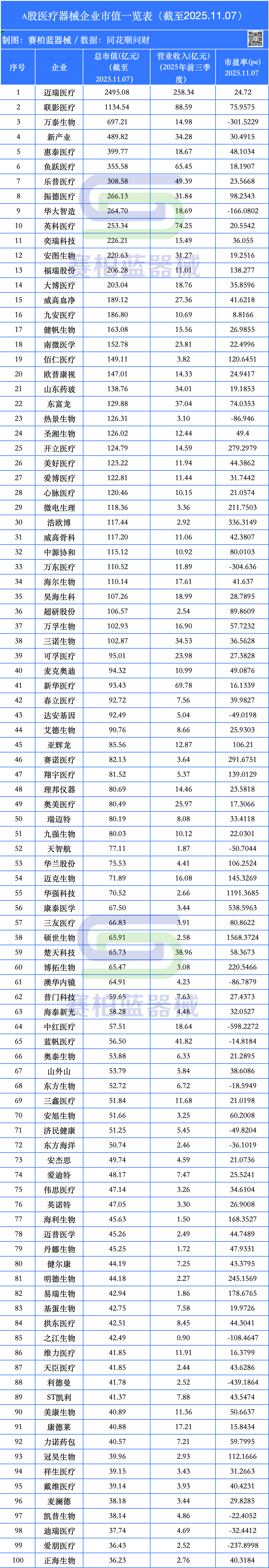 市值作为资本市场最核心的价值标尺,凝结了市场对企业价值的综合判断。根据医疗器械企业前三季度业绩情况,部分细分行业已迎来拐点,相关企业的市值也在发生变动。 01 100家A股器械企业市值排行 头部企业表现稳定 同花顺问财数据显示,截至2025年11月7日,A股医疗器械上市企业总市值排名前10的企业分别为迈瑞医疗、联影医疗、万泰生物、新产业、惠泰医疗、鱼跃医疗、乐普医疗、振德医疗、华大智造、英科医疗。 观察上述排行,相比2025年中报发布阶段(截至9月9日)的市值情况,前十位变动不大,头部企业表现稳定。 分板块来看,医疗设备领域在经历长时间低迷之后,国内市场迎来拐点,海外市场表现尤佳,在高端产品线不断取得突破性进展之下,集采承压后的毛利率逐步恢复。 耗材端表现在经历多年集采常态化和DRG/DIP改革之后,逐渐显现发展韧性。高值耗材冲刺高端,获批产品数量呈增长态势。 体外诊断领域则面临多重挑战。大规模集采加上全国范围内检验项目价格治理等,多细分领域大规模集采后价格降幅明显。但集采一定程度上加速国产头部企业市场覆盖率提升,国产替代呈加速趋势。 02 国内高端替代成突破口 国际市场开拓加速 在医疗领域多重改革下,医疗器械产业降本增效成大势所趋,中低端同质化竞争激烈,高端国产替代与海外市场拓展成器械企业核心竞争的两大主线,中国医疗器械行业正在步入新的发展阶段。 近年来,随着审评审批制度改革的深化以及企业研发投入增加,行业新产品加速迭代,供给能力持续提升,我国医疗器械新品上市保持高位。据国家药监局南方医药经济研究所统计,2025年1-9月,我国境内二、三类医疗器械首次注册量分别为10180件、2164件,均保持在历史较高水平。 创新产品的获批速度也在加快。2025年1-9月,国家药监局共批准创新医疗器械58个,较去年同期增长23.4%,增速高于同期8.77个百分点,数量续创新高。截至2025年9月底,国家药监局已累计批准创新医疗器械373个,高端器械的可及性得到显著提升。 此外,观察今年耗材集采情况,经过多轮迭代和实践,集采政策继续优化升级,规则更加理性化与精细化。反内卷原则的明确提出,有效避免了超低价中标的恶性竞争。同时多地集采为创新医疗器械开通“绿灯”,为企业研发创新留出更多空间。 国家层面推动的医疗卫生领域设备更新改造行动,在今年开始迎来“收获期”。根据众城医械数据,2025Q3中国医疗器械公开招标中标市场规模同比增长约30%,其中医学影像设备市场规模同比增长55%。 国产中高端设备厂商在此次更新换代过程中加速拓展国内市场,设备采购订单带来的营收开始在三季度报告中有所体现,多家设备企业业绩迎来拐点。如迈瑞表示,得益于上半年医疗设备招标活动的恢复,从第三季度开始国内设备类业务均开始复苏,营收同比降幅明显收窄。 国际市场影响力正在成为头部医疗器械企业的核心竞争力之一。多家头部器械企业的前三季度报告显示,海外市场业务增速好于国内市场,国际业务成为提升营收和利润的关键要素。 如迈瑞Q3国际业务同比增长11.93%,其中欧洲市场同比增长超20%;新产业2025年前三季度主营业务收入14.67亿元,同比增长 21%,其中试剂业务表现尤为突出,收入同比增长 37%,推动海外综合毛利率提升至 69.49%,已超越国内市场水平;鱼跃医疗2025年上半年海外业务营收已达6.07亿元,同比增长超26%,在总营收中的占比也提升至13.03%。 据国家药监局南方医药经济研究所统计,2025年1-8月,我国医疗器械行业对外贸易总额4073.97亿元,同比增长6.29%。其中出口2457.99亿元,同比增长6.84%,保持稳健增长态势;进口1615.98亿元同比下降5.43%,进口需求整体收缩;贸易顺差扩大至842.01亿元,同比增长103.58%; 2025年1-9月,中国企业在美国的医疗器械获批数量375件,占比占美国同期获批数量的16.1%。我国医疗器械企业的技术实力与合规能力国际认可度提升。 整体来看,凭借技术高效迭代、本土成本优势和政策支持等多项优势,国产医疗器械企业产品结构正在向高端化、多元化跃迁,中高端领域的国际竞争力得到持续提升。 |