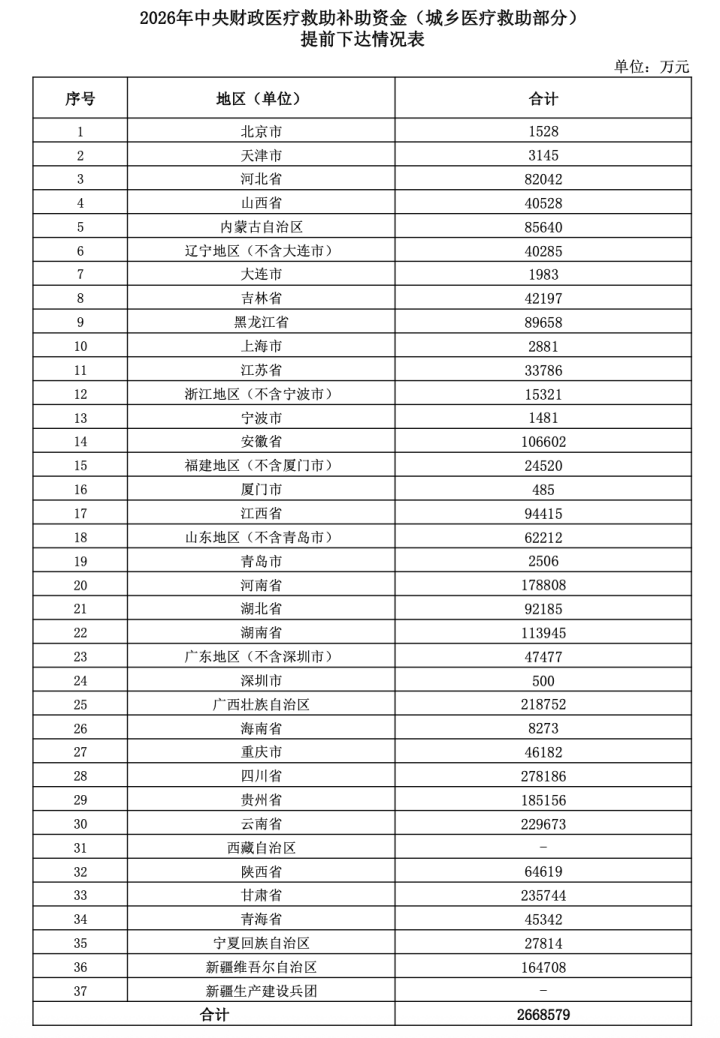 据统计,本次提前下达金额共计约4165.57亿元,其中2026年中央财政城乡居民基本医疗保险补助提前下达3863.66亿元,提前下达2026年中央财政医疗救助补助资金(城乡医疗救助部分)预算266.86亿元提前下达2026年中央财政医疗服务与保障能力提升补助资金(医疗保障服务能力建设部分)35.05亿元