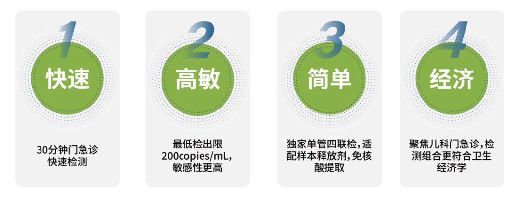 检测数量:4项 注册人:北京京东方知微生物科技有限公司 技术原理:荧光PCR法 检测靶标:呼吸道合胞病毒、副流感病毒、腺病毒、肺炎支原体的核酸 样本类型:咽拭子 检测时间:<30min 注册证号:国械注准20243402636 注册时间:2024 试剂有效期:2℃~28℃避光干燥保存,有效期12个月。