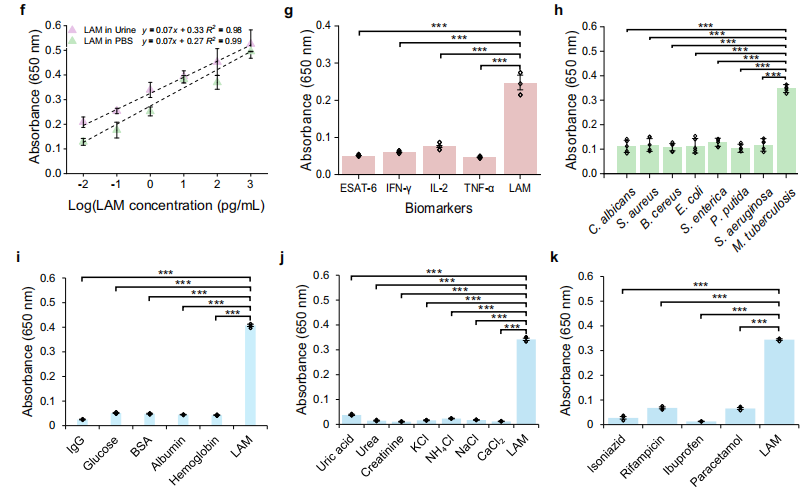 此外,作者还检测了大量尿蛋白和代谢物,如IgG、葡萄糖、BSA、白蛋白和血红蛋白(图i),以及内源性物质(图j)(尿酸、尿素、肌酐、氯化钾、NaCl、NH4Cl、CaCl2)和外源性化合物(图k)(异烟肼、利福平、布洛芬和扑热息痛)的潜在干扰,均未观察到对分析信号的明显干扰。这些结果都说明,LIC对结核分枝杆菌裂解物具有高特异性。