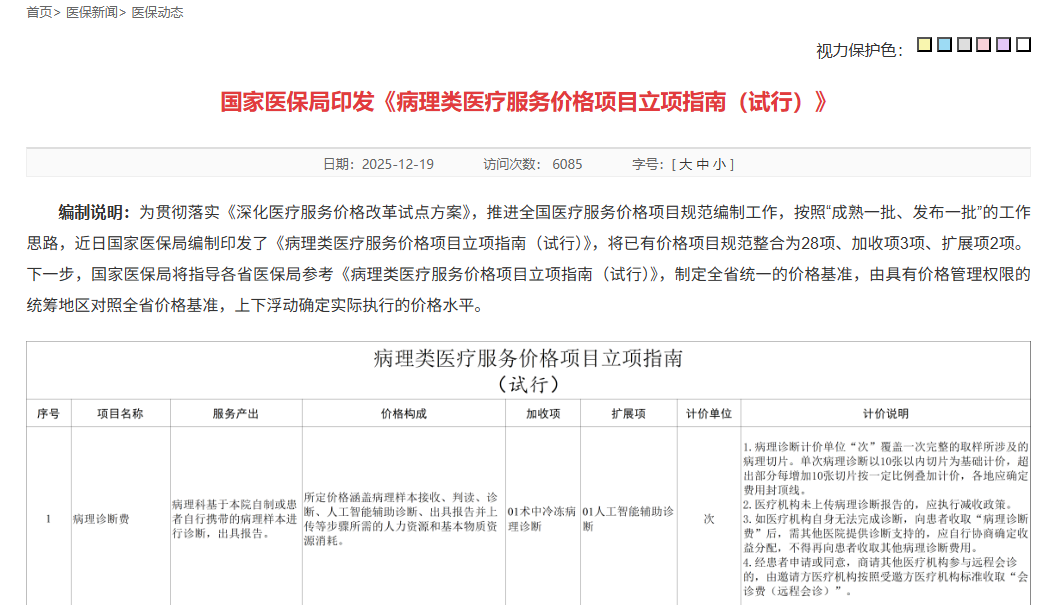 12月19日的印发的《病理类医疗服务价格项目立项指南(试行)》,标志着我国病理服务价格体系迎来系统性重塑。该指南将现有病理类价格项目整合为28项核心项目、3项加收项和2项扩展项,聚焦活检取样、样本处理、切片复制、病理染色、病理诊断等环节。