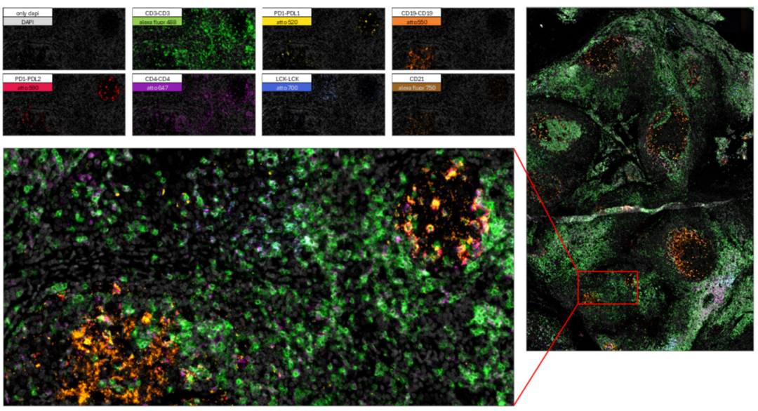前言 无需破碎细胞,一次实验就能看清九种蛋白质的实时动态。 在癌症这个复杂的疾病中,蛋白质很少单打独斗,它们的功能和活性往往通过与其他分子的相互作用和化学修饰来决定。 传统方法通常只能告诉我们某个蛋白质“在哪里”,或者“有多少”,却很难揭示它在“做什么”——是处于激活状态,还是与谁在“密谋”推动肿瘤生长。 “多重原位邻近连接检测(Multiplex in situ proximity ligation assay, misPLA)” 就像一个安装在细胞内部的超高清多功能摄像头,能够同时捕捉多达九种蛋白质的动态活动,而且是在不破坏细胞和组织结构的前提下。 01 技术突破:从“静态照片”到“动态直播” 空间蛋白质组学已经能描绘蛋白质在细胞和组织中的分布图,但这就像一张静态照片,信息有限。了解蛋白质的 “功能状态” 才能揭示细胞决策、命运决定和组织功能的深层机制。 发表在 bioRxiv 上的这项研究,展示了一种创新的检测方法——多重原位邻近连接检测。 它的核心原理是:一种特殊的 “抗体-寡核苷酸”探针。每种抗体负责识别并结合一个特定的蛋白质靶点,而它身上携带的寡核苷酸则像一串独特的“条形码”。当两个靶点蛋白在空间上足够接近时,它们各自的抗体探针也会靠拢,两段寡核苷酸可以连接起来形成一个环状的DNA模板。通过滚环扩增技术,这个小小的DNA环能被放大成上百万份拷贝,形成一团在显微镜下清晰可见的荧光信号点。最关键的一步在于多重检测。通过设计多组不同“条形码”的抗体探针,并在实验中分批次用不同颜色的荧光来显示这些条形码的扩增产物,研究人员能在一次实验中,顺序检测多达九对蛋白质的相互作用或修饰状态。 02 实战检验:从细胞到组织,从基础到临床 理论很美好,实际效果如何?研究人员在多个层面进行了验证。 在培养的SK-BR-3细胞中,他们用EGF(表皮生长因子)刺激细胞,模拟癌症中常见的信号通路激活。利用misPLA,他们成功同时可视化了STAT5a、STAT3、AKT、ERK和EGFR等关键信号蛋白的磷酸化状态变化。在未刺激的细胞中,这些信号微弱;而一旦受到EGF刺激,代表蛋白质激活的荧光信号点便大量出现,清晰地展示了信号通路的即时启动。 不仅如此,他们还检测了包括 MEK1-ERK2、EGFR-GRB2、STAT3-STAT5a 在内的九对蛋白质相互作用。结果同样表明,EGF刺激显著增强了这些蛋白质“搭档”之间的空间邻近性,生动描绘了信号从膜受体向下游传递的连锁反应。 这项技术不仅适用于培养细胞,更能直接应用于临床组织样本——福尔马林固定石蜡包埋组织样本。研究人员分析了三种经典霍奇金淋巴瘤亚型和一个胸腺瘤样本。通过检测九对信号蛋白的相互作用,他们为每种样本绘制了独特的信号通路“指纹”。 例如,在侵袭性较强的混合细胞型和淋巴细胞消减型淋巴瘤中,EGFR-GRB2和 GRB2-MEK1 的信号密集,表明MAPK信号通路被强烈驱动。而在淋巴细胞为主型样本中,EGFR-GRB2信号很弱,但GRB2-MEK1仍可检测到,提示其MAPK信号输入可能被“截断”,这与该亚型较低的增殖驱动特性相符。这些发现说明,misPLA能够区分组织学上相似但分子机制不同的肿瘤,为预后判断和靶向治疗选择提供了宝贵的分子背景信息。 03 更广阔的应用:描绘免疫微环境与指导精准治疗 技术的潜力远不止于此。研究团队还应用了一个九重免疫谱系/粘附分子检测组合,在扁桃体样本中同时绘制了 CD3、CD8、CD19、CD79b、EGFR 等多种标志物的空间分布。结果清晰地区分出富含T细胞的副皮质区、B细胞聚集的滤泡区、生发中心等结构,展示了免疫细胞在组织中的精确定位和空间关系。与单一检测相比,多重检测并未牺牲灵敏度或特异性,证明了其在高丰度蛋白检测中的可靠性。 在慢性粒细胞白血病(CML)患者血液样本的分析中,misPLA揭示了患者间和细胞间的异质性。通过分析AKT、JAK/STAT和MAPK等通路,他们发现两名患者的信号激活模式既有相似之处,也存在差异。例如,一名患者表现出更广泛的跨通路激活,而另一名则更集中于特定通路。更精细的分析显示,在大多数癌细胞中,STAT5信号占主导,而活化的STAT3仅在一小部分细胞中富集,这种细胞间的异质性可能影响患者对不同治疗药物的反应。这表明,通过在原位检测恶性细胞的信号通路扰动,misPLA有望帮助医生为个体患者选择最优的治疗方案,甚至在短期药物孵育后预测疗效,真正迈向精准医疗。 04 未来展望:功能蛋白组学的常规利器 近十年来,空间组学技术蓬勃发展,但大多数技术仍停留在“谁在哪里”的描述层面。misPLA的出现填补了“正在发生什么”这一功能层面的空白。当然,技术仍有局限:每轮检测的荧光颜色数量有限、结果证明的是空间邻近而非直接物理接触、定量分析需要校准标准等。但无论如何,misPLA已经确立为一种实用、可扩展的技术平台,为所有需要空间背景和功能性解读的生物学问题提供了强大工具。随着探针库的扩展和图像分析流程的成熟,它有望成为功能原位蛋白质组学的常规利器,从基础细胞生物学到生物标志物发现,再到精准病理学,深刻改变我们对细胞和组织的理解。 探秘微观,引领生命科技前沿!精准偶联,开启分子操作新时代;超敏检测,赋能临床检验新应用!杭州乐为生医科技有限公司,精心打造多款科研利器: