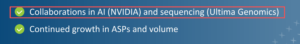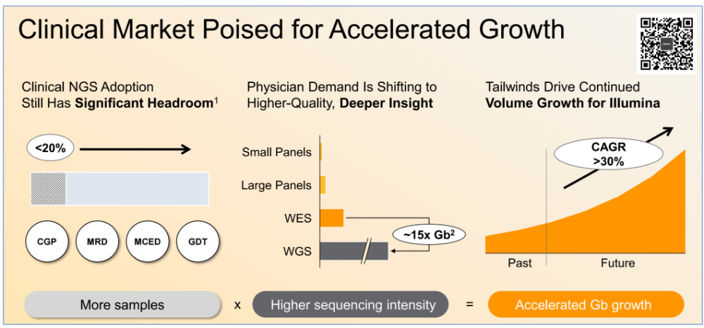 Illumina因美纳可以向中国出口基因测序仪。 但是这里有个前提,“国内企业可申请与上述实体进行交易,不可靠实体清单工作机制将依法进行审核,对符合条件的申请予以批准” 对Illumina因美纳来说确实是利好,但是,还不够彻底。 ” 这5500万美元全是试剂耗材,国内的客户真的,太忠诚了。换句话说,国内诸如华大智造、真迈、赛陆们还有市场可分。我们再来看这张Slide,基本可以廓清Illumina未来策略的基石。第一,推动WGS(全基因组测序)转换,扩大测序通量需求。很好理解,对吧?别整啥WES、Panel了,直接上WGS吧。很好理解,不管是单细胞技术还是蛋白组学,Illumina的根本出发点(至少是根本之一)就是卖自家的测序。另外,Illumina的空间生物学产品今年上半年就会出来,呃,我应该跟大家之前汇报过对吧?(AGBT的时候是不是提过?忘了)第三,临床个性化健康医疗需求拉动NGS的应用深度。我们看这张图,随着MRD、MCED的发展,对测序的需求显然是有拉动作用的。Illumina必然会继续支持、推动这种数据密度型应用的发展。不过,有个坏消息是美国MRD大佬Natera在JPM上发了这么一句:第四,新药研发、精准医学,包括对AI的使用拉动了大规模队列的需求。这很好理解,新药研发渴望通过使用AI来降低研发成本、控制研发风险、提高研发效率。然而,要实现这么牛X闪闪的AI就得有足够的数据来训练AI。这里面一个重要的切入点就是Perturb-Seq,这也是Illumina引入“十亿细胞图谱”的原因。好的,看完这一切你觉得对Illumina的未来有信心么?Illumina官方引用CEO的表述:Thaysen 对出口限制措施的解除表示振奋,强调将继续与相关政府部门和利益相关方沟通,推动长期可持续的解决方案。投资人表示情绪稳定,这两天Illumina股价变化不大。好了,今天就到这里了,咱们循因缉药也会继续关注Illumina,大家明天见。 注1:Illumina JPM PPT(见前面的JPM slides系列)