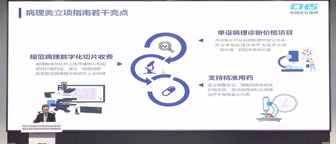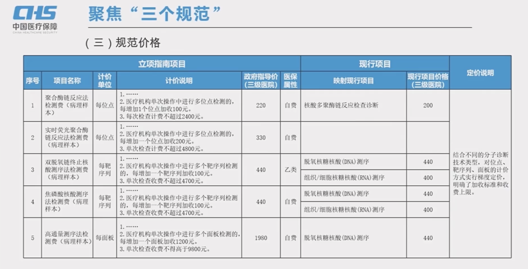 面板的认定,以产品注册使用说明标注内容为准” 去年底,国家医保局正式公布了《病理类医疗服务价格项目立项指南(试行)》。今年初,重庆医保局率先抛出了实施细则的征求意见稿。昨晚,国家医保局召开了第五场医疗服务价格项目立项指南解读活动,进一步明确了病理立项指南中的相关细节。整场活动2个多小时,大家有时间可以去医保局官方公众号看看直播。我们就比较关注的分子诊断类项目摘取了看到的一些重要信息。PS:这篇仅代表个人观点。如果我俩理解不一样,那么你是对的。欢迎留言区探讨。在这次的指南解读活动上,国家医保局价格招采司王小宁司长也再次强调了立项指南的意义:在介绍病理类立项指南的亮点时,对于分子诊断类项目纳入价格指南的期待,王小宁司长的表述是:在卞修武院士的演讲中,也强调了病理类立项指南对于分子诊断类项目合规、合理开展的促进作用:对这些检测项目中间非常适用于一些用于直接指导靶向治疗的叫做伴随诊断的那些检测项目,这些项目从过去到现在我们病理界还有临床医生都会对这部分感到有诸多的不足,那么这次把它理顺了。避免了很多该做的基因检测,因为没有价格或者不合理的价格,导至了很多错误的出现。作为率先落地病理立项指南相关细则的直辖市,此次解读活动也邀请了重庆市医保局吴良和副局长就重庆的实施细则进行了解读。1. 对于靶序列、面板的认定,以产品注册使用说明标注内容为准。2. (指南)为分子病理项目的开展提供了有力的支撑,鼓励医疗机构开展更多的精准检测服务。作为国家医保局的官方解读活动,邀请重庆医保局进行细则的分享可以理解成一种定调:1. 在对于“面板”的定义上,各省份应该都是以“特定基因/位点数量为一个面板单位”的形式进行,且均以产品注册使用说明(说明书)为准!2. 各省份在组成一个面板的基因/位点数量上可能会有差异。1. 通过“合规收费”的闭环,分子诊断类项目尤其是伴随诊断项目在临床上的应用会得到进一步的促进。2. 产品拿证是通过立项指南获得收费依据的必备条件。对已经拿证的肿瘤NGS项目,如果产品说明书中同时存在基因和位点,以哪个作为面板的定义依据?是取高还是就低?对于大家颇为关注的检验类医疗服务价格项目立项指南,按照国家医保局价格司王小宁司长的表述,也会在近期发布,我们持续关注吧。以重庆为例,NGS的封顶价是9800,但并不代表所有“理论上能封顶”(24基因或者120位点)的产品最终的定价都会是封顶价。最终的价格会是基于“产品理论收费上限”的谈判结果。希望相关方面根据临床价值、供需关系、竞争格局、支付能力等因素,合理定价,让科技创新更好的造福于民!