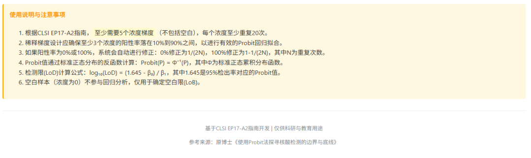 LOD还需要密切与使用用途相结合。合适的才是最好的。比如现在正是流感刚发的季节,你知道了流感的高流行率,身边有人中招了,你隐隐感觉自己不舒服了。这个时候你需要一个LOD很低的试剂吗?纯靠抛硬币也会很准。当检测与贝叶斯相遇:检测判阴阳,贝叶斯辩真伪 对于检测来说,未来不应还是一次次独立的检测结果,而是会在流行病学大数据和人工智能的加持下变得更加准确和贴近实际。 CLSI EP17-A2 Evaluation of Detection Capability for Clinical Laboratory Measurement Procedures; Approved Guideline—Second Edition 制作了一个probit法计算最低检测限(LOD)的计算器,输入浓度、阳性数和总数就可以自动计算LOD并且绘制出剂量-反应曲线和probit回归曲线。大家可以用我的文章作为附件上传,让大语言模型生成一下。成功了记得打赏哦。