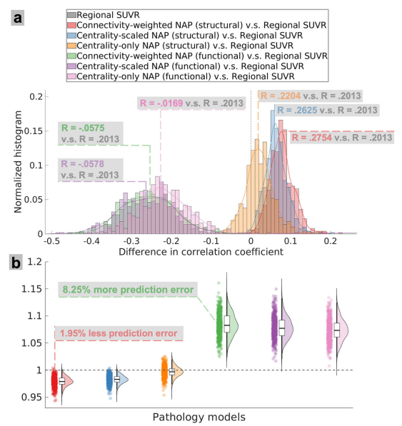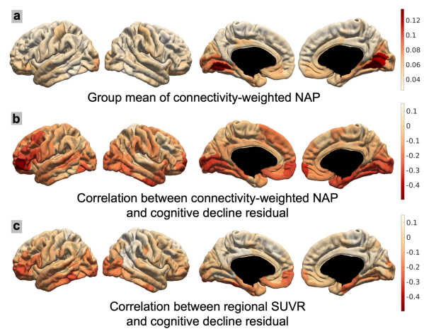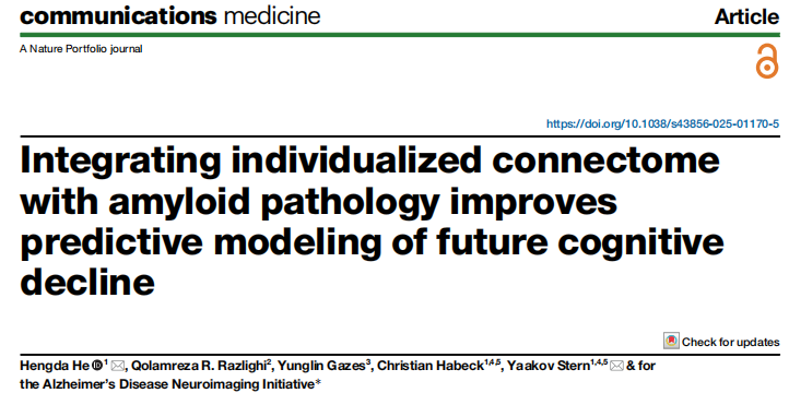 近日,美国哥伦比亚大学联合其他机构在杂志Communications Medicine上发表了一篇题为“Integrating individualized connectome with amyloid pathology improves predictive modeling of future cognitive decline”的文章。作者将Aβ病理的空间分布与个体大脑网络架构相结合,构建了基于网络的Aβ负担的指标。研究结果表明,将个性化的结构连接组而不是功能连接组信息纳入Aβ测量可以提高对预期认知衰退的预测性能。 图片来源:Communications Medicine 主要内容 结合个体大脑网络架构的Aβ病理学指标的构建 研究者利用扩散磁共振成像获取个体化结构连接组,利用静息态功能磁共振成像获取功能连接组,并分别与淀粉样蛋白PET的区域数据结合,生成了基于结构连接和基于功能连接的两类NAP分数。 其中,连通性加权NAP(图e和h)不仅考虑了目标脑区本身的淀粉样蛋白沉积,还通过结构或功能连接矩阵,将与之相连的其他所有脑区的淀粉样蛋白沉积进行加权求和。中心性标度NAP(图f, i)将目标脑区自身的淀粉样蛋白沉积水平,按该脑区在整个连接网络中的“中心性”(即节点强度)进行校正。 基于网络的β淀粉样蛋白病理学(NAP)。图片来源:Communications Medicine 基于结构连接组的Aβ模型改善了对随后认知衰退的预测 作者评估了两种NAP指标在预测纵向认知能力下降方面的性能,并将其与使用Aβ病理PET成像标准化摄取值比(SUVR)值的预测性能进行比较。 交叉验证模型证实,仅使用基线区域性淀粉样蛋白SUVR即可显著预测后续全球认知分数的下降(中位相关系数 R=0.2013)。当将个体化的结构连接组信息整合到淀粉样蛋白指标中(基于结构的连通性加权NAP)时,预测未来全局认知衰退的性能达到了最高(中位相关系数 R=0.2754)(图a,b),其性能显著优于仅使用区域SUVR的传统方法。基于结构的其他NAP指标也显示出类似的优势。 与基于结构的连接组相反,功能连接组构建的NAP指标,未能提升预测性能甚至差于区域SUVR模型(图a,b)。这可能是因为淀粉样蛋白等错误折叠蛋白的跨突触传播可能更直接地由结构性解剖连接所介导,考虑淀粉样蛋白在个体结构性神经网络中的分布模式,能更有效地捕捉其与认知功能恶化之间的复杂关系。 不同病理模型下认知衰退预测的性能表现。图片来源:Communications Medicine 对预测认知衰退贡献最大的脑区 为了识别大脑ROI对观察到的病理和认知之间的关系贡献,作者对每个ROI的病理特征和认知变化进行相关性分析。分析结果显示,颞叶和枕叶的基底皮质区域以及内侧前额叶皮层和左背外侧前额叶皮层,表现出更强的纵向认知变化负相关(图b)。在高亮区域(红色显示)淀粉样蛋白病理水平较高的个体,认知能力下降的速度往往更快,而在这些区域淀粉样蛋白负担较低的个体,认知能力下降的速度往往较慢。此外,与区域SUVR评分相比(图c),NAP评分与纵向认知变化表现出更明显的负相关(图b)。 区域标准化摄取值比(SUVR)和基于网络的β淀粉样蛋白病理(NAP)图。图片来源:Communications Medicine 外部数据集验证模型的泛化性能 在独立的ADNI外部数据集中,作者利用从内部队列中识别出的同一组特征脑区(无论是区域SUVR还是结构连通性加权NAP)所提取的特征,预测结果与实际的认知下降的得分成绩(dMemory)均显著相关(如下图)。且在相关分析中,NAP指标(尤其是连通性加权)与认知变化之间的负相关关系也显著强于区域SUVR指标,表明其对认知衰退具有更高的敏感性。 Aβ神经病理学特征的外部验证。图片来源:Communications Medicine 观察到的NAP测量与纵向认知能力下降之间的关系不能完全用tau病理学来解释 鉴于tau PET测量与认知能力下降密切相关,作者进一步测试了认知和淀粉样蛋白之间的关系是否可以用tau病理学来解释。在拥有tau PET数据的子样本中进行的分析表明,淀粉样蛋白NAP指标与认知衰退的关联,在校正了全局或颞叶tau病理后依然显著。这说明NAP所捕获的认知衰退预测信息不能完全由tau病理负担来解释,提示了其独立的价值。 |