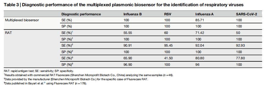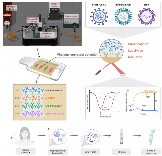 呼吸道病毒感染已成为21世纪的重大健康问题,每年导至数十亿病例,死亡率和经济社会影响不断攀升。不仅有SARS-CoV-2及其变种,季节性高致病性病毒,如甲/乙型流感病毒(IAV/IBV)和呼吸道合胞病毒(RSV)也在秋冬季共同流行,且临床症状(如发热、头痛、喉咙痛、咳嗽)高度重叠,仅凭症状无法区分。为了有效控制传播,指导及时治疗并防止大规模暴发,扩展快速、多重病原体诊断检测的可及性至关重要。 目前,临床诊断主要依赖两类技术,.基于核酸扩增的分子检测如PCR是诊断金标准,具有高灵敏度和特异性,并可实现多重检测。但成本昂贵,且需要专业实验室和操作人员,限制了其POCT的使用。快速抗原检测(RAT)作为POC替代方案,性能处于中等或较低水平,灵敏度波动很大。因此,需要开发一种新的诊断工具,保持高灵敏度和特异性的同时,具备POC检测的快速、简便和低成本特性,并能实现多重检测。 近日,来自西班牙的一组研究团队在杂志npj Biosensing上发表了一篇题为“Disposable Point of Care multiplexed plasmonic biosensor for rapid and specific identification of respiratory viruses”的文章。作者开发了一种基于无标记等离子共振技术的多分析物诊断平台,用于快速识别、区分和定量最常见的呼吸道病毒(SARS-CoV-2、流感 A/B 病毒和呼吸道合胞病毒)在鼻咽拭子中的病毒抗原,能够达到纳克/毫升级别的低检测限。临床验证表明,这种新型诊断平台具有高灵敏度(97.22%)和高特异性(100%),与基于 PCR 的分子检测具有极好的相关性。其准确性和用户友好型设计,此传感器可被定位为一种在医疗现场快速进行多重病毒感染诊断的诊断工具。 图片来源:npj biosensing 主要内容 多重等离子生物传感平台的原理与设计 研究团队开发了一个集成的诊断平台(如下图),集成了卤素灯、光谱仪和电机驱动的线性位移台,这些组件都集成于一个便携箱体中。作者还定制了一款一次性微流控芯片,尺寸为 50 × 28 毫米,专为一次性POCT应用而设计。选择病毒的保守核衣壳蛋白/核蛋白(NP)作为检测目标,等离子传感器芯片四个独立的传感区域(通道CH1-CH4)上分别固定了四种特异性抗体,CH1抗乙型流感病毒(IBV)、CH2抗RSV(A/B型)、CH3抗甲型流感病毒(IAV)、CH4抗SARS-CoV-2。这种蛇形布局允许从单一样本中同时检测、鉴别和量化四种不同的病毒NP。 病毒核蛋白诊断平台的工作流程。图片来源:npj biosensing 多重检测的优化与性能评估 多重检测时,高浓度NP会在非目标通道中出现显著的非特异性结合信号(下图 A),作者通过在运行缓冲液中加入硫酸葡聚糖(DS),有效抑制了非特异性相互作用(图 B)。最终得到的检测限(LOD)分别为,乙型流感核蛋白为 31.43 ng/mL、RSV A 核蛋白为 30.63 ng/mL、RSV B 核蛋白为 19.95 ng/mL、甲型流感核蛋白为 118.18 ng/mL、SARS-CoV-2 核蛋白为 10.60 ng/mL。 在所测浓度范围内,非特异性病毒纳米颗粒未观察到交叉反应。这些结果表明,该生物传感器具备同时有效识别、区分和定量四种不同呼吸道病毒的抗原的能力。 生物传感器的优化和特异性。图片来源:npj biosensing 鼻咽样本中的生物传感器性能 作者还优化了适应临床样本(鼻咽拭子)的前处理方法,通过将鼻咽拭子样本与裂解缓冲液按1:1稀释、0.22 μm过滤,几乎完全消除了背景信号,大大提高了信噪比。在优化条件下,该多重生物传感器针对五种病毒NP(RSV分A/B型),获得了宽线性范围和纳克/毫升级别的检测限(LOD)(如下图)。在临床样本基质中,对SARS-CoV-2 NP的LOD为6.90 ng/mL,乙流为 32.03 ng/mL、RSV A 为 12.03 ng/mL、RSV B 为 13.68 ng/mL、对甲型流感病毒NP的LOD相对较高,为148.93 ng/mL。 鼻咽样本中的生物传感器性能。图片来源:npj biosensing 一次性微流控芯片的临床验证 作者设计了一款专为POCT应用的一次性微流控芯片,并使用了来自医院患者的46份经RT-PCR明确诊断的鼻咽拭子临床样本(36份阳性,10份阴性)进行验证。 结果显示,与PCR结果相比,该多重等离子生物传感器展现了97.22%的灵敏度和100%的特异性。仅有一个PCR Ct值较高(33.44)病毒载量低的甲型流感阳性样本被判定为阴性。而对于除甲型流感外的其他病毒,即使是在PCR Ct值>33(即病毒载量很低)的样本中,传感器也能准确诊断(如下表)。传感器测得的NP浓度与PCR的Ct值之间存在极强的负线性相关关系,这说明传感器信号能够反映病毒载量的变化,提供了除定性诊断外的定量信息。 作者开发了一种即时检测多重等离子生物传感器,能够同时检测多种病毒靶标。该生物传感器设备能够快速识别、区分和定量鼻咽拭子中的四种最常见病毒病原体(SARS-CoV-2、流感 A 型和 B 型以及 RSV)的病毒抗原。与PCR结果相比,该多重等离子生物传感器展现了97.22%的灵敏度和100%的特异性。仅有一个PCR Ct值较高(33.44)病毒载量低的甲型流感阳性样本被判定为阴性。且传感器测得的NP浓度与PCR的Ct值之间存在极强的负线性相关关系,这说明传感器信号能够反映病毒载量的变化,提供了除定性诊断外的定量信息。 未来需要更大规模的临床研究来全面评估其诊断潜力,并需要在未来的研究中深入探讨此方法与其他病原体的潜在交叉反应性,以及针对不同病毒变异株的检测性能。总的来说,所获得的结果使此生物传感器成为一种准确且可靠的工具,可用于同时、快速和可靠地识别、区分和定量四种主要病毒病原体。独立、一次性使用的生物功能化芯片,还使得这项技术能够潜在应用于多种诊断