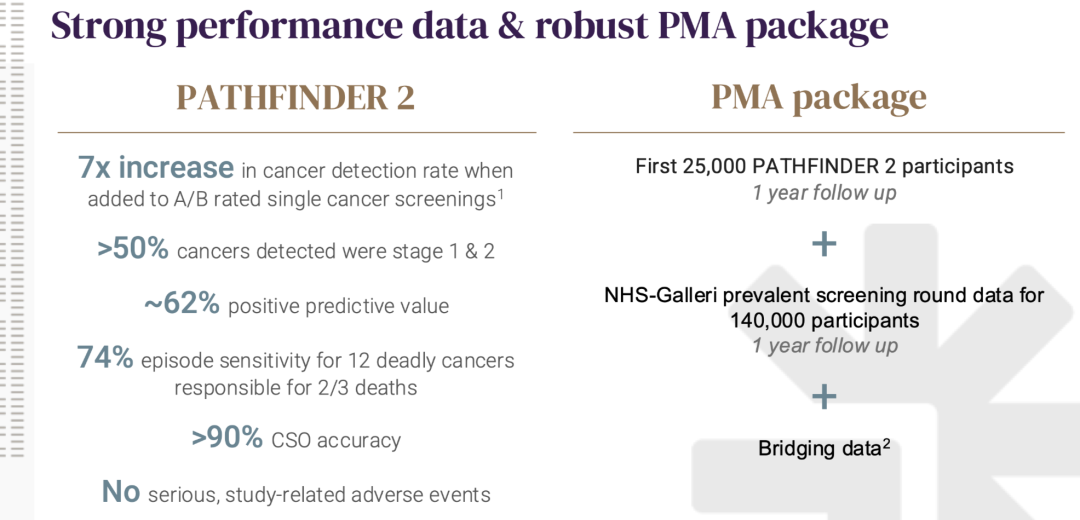 两大梦幻单品,分别有哪些获批难点和看点?” “合规拿证,会开启全新的增长时代”一直没等到国内的检验立项指南发布,所以我们先看看海外。1月29日,Grail宣布其多癌早筛产品Galleri完成了FDA PMA(上市前申请)的提交:另外,最新消息是MCED医保报销的法案已经如我们所预测,获得了总统签字批准,详情如下:4天后的2月2日,Natera宣布其定制化MRD产品Signatera的CDx适应症完成了FDA PMA的提交:一周之内,两个承载肿瘤NGS未来增长梦想的单品,都正式进入了合规拿证的冲刺阶段。PS:这篇仅代表个人观点。如果我俩理解不一样,那么你是对的。欢迎留言区探讨。 PS:视频速览版在文末哦😄 两款产品提交PMA的证据如下:PATHFINDER 2+NHS-Galleri(第一年)+新旧版本的桥接数据其中最核心的数据肯定是P2,用于证明test performance关于P2的详细分析,我们之前写过了,感兴趣的可以去回顾下:提交PMA的证据包更简单,因为它的适应症选的很硬:MIBC(浸润性膀胱癌)术后使用阿替利珠单抗进行辅助治疗的伴随诊断注册临床的研究结果发表在了NEJM上,完成了MRD的三重证明闭环:MRD+,从用药中获益;MRD转阳,从用药中获益;MRD-,无需用药;关于IMVigor 011的详细分析,我们之前也写过了,感兴趣的去回顾:首先,我的观点很明确:这两个产品拿证都是板上钉钉的事情,没有“成或不成”,只有“快或慢”。同时,这个获批也会首次从合规层面给出一个大家都关心的答案:在IMvigor 011中,Natera给出的回答是“1+6+1”——1次基线、每6周做一次监控(持续9个月)、第12个月再做一次监控如果最终真的获批1+7的话,MRD将正式变为“高频复购产品”,商业模式的根基有了质的提升。下面这个让大家流了很久口水的增长就只不过是开胃菜而已了:同时,虽然首张PMA局限于膀胱癌这一细分适应症,但它的核心价值在于打破了FDA对实体瘤MRD技术的监管坚冰。一旦监管路径跑通,后续结直肠癌、肺癌等大癌种的扩项将不再有监管阻碍。上市四年,Galleri总共卖出去了不到48万份,和cologuard这样的季度百万精英相比,绝对是不够看的。我们在之前分析EXAS增长时就提过,一个筛查产品想要放量,有三步:最新消息,美国时间2月3日,川普已经正式签字通过了MCED报销法案2029年生效,起始65岁以下(不含),报销价对标肠癌筛查同时,最终FDA的批准也会回答大家很关注的另一个问题:类似于Pathfinder 2这样的证据,究竟能支撑监管部门批准哪些癌种打包进MCED?这不仅关乎US,也会给全球其他地方的监管机构提供重要的参考。两个承载着肿瘤NGS未来梦想的大单品,终于走到了合规拿证的那一刻。