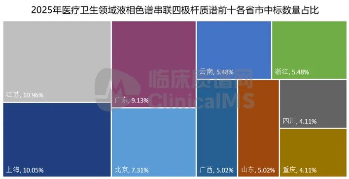 省份层面,采购量前十的省份为江苏、上海、广东、北京、云南、广西、浙江、山东、重庆、四川,合计占全国总量的66.67%。前十省份覆盖三大核心区域,且南方省份占据主导,进一步印证了我国临床质谱市场需求的区域集中度与经济医疗发展水平的强关联性。
