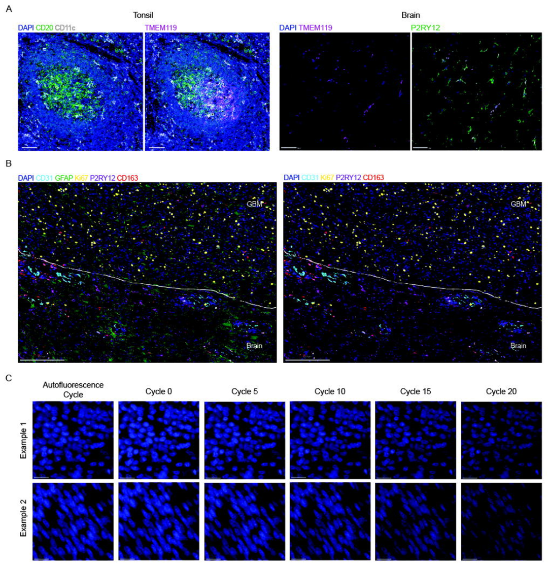 研究团队针对中枢神经系统建立了200余种标志物的验证库,涵盖胶质瘤、阿尔茨海默病、癫痫等多种疾病。其中特别关注了小胶质细胞特异性标志物P2RY12,相比TMEM119,其在人脑组织中更具特异性。 此外,团队还开发了系统的: 抗体优化流程:通过浓度梯度测试确定最佳信号强度 背景荧光校正策略:利用系统自带的荧光淬灭与图像减影功能,有效去除脑组织自发荧光干扰 标志物排列建议:根据抗原稳定性决定其在染色循环中的顺序