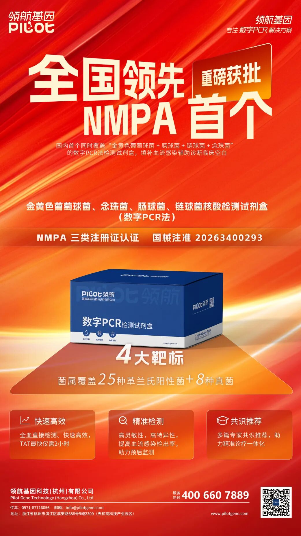 此次“金黄色葡萄球菌、念珠菌、肠球菌、链球菌核酸检测试剂盒”的获批,是领航基因在感染性疾病分子诊断领域的又一重要突破,也标志着其全链条解决方案布局的进一步完善。作为专注数字PCR解决方案的国家级高新技术企业,领航基因始终以临床需求为导向,从半自动到全自动平台的迭代,从单一试剂到双试剂协同的拓展,持续推动感染检测技术的革新与落地。未来,领航基因将继续深耕精准诊断领域,凭借全链条合规优势与技术创新实力,为临床抗感染诊疗的精准化及快速化提供支撑,护航患者生命健康。