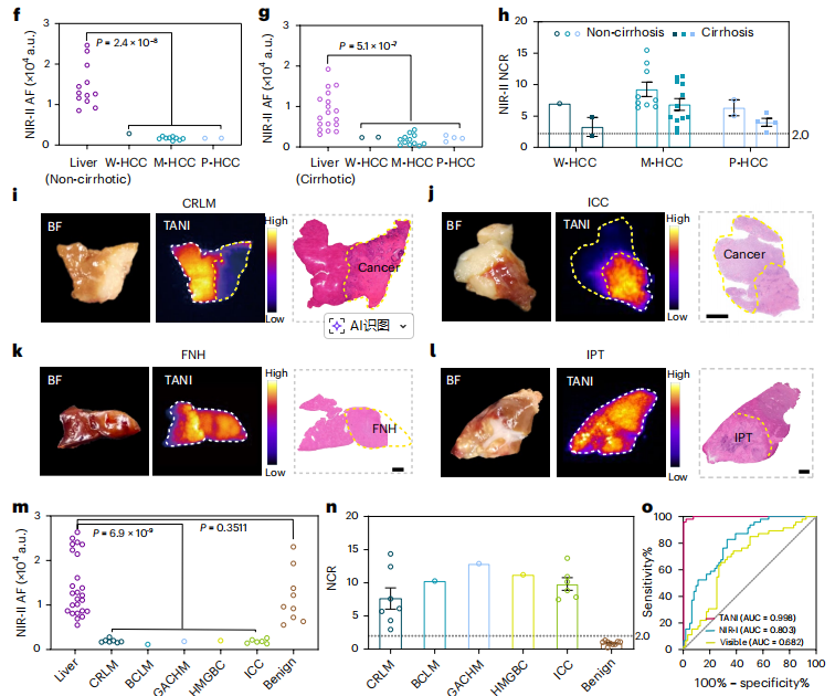 作者评估了TANI在诊断非肝硬化和肝硬化肝脏中的各种肝细胞癌(HCC)方面的普遍适用性。结果显示,肝硬化肝脏组织也表现出强烈的近红外 II 波段荧光强度(NIR-II AF)(图 g),但较非肝硬化肝脏组织略低(图 f),非肝硬化和肝硬化患者的平均 NCR 值分别为 8.56和 5.80(图 h)。
