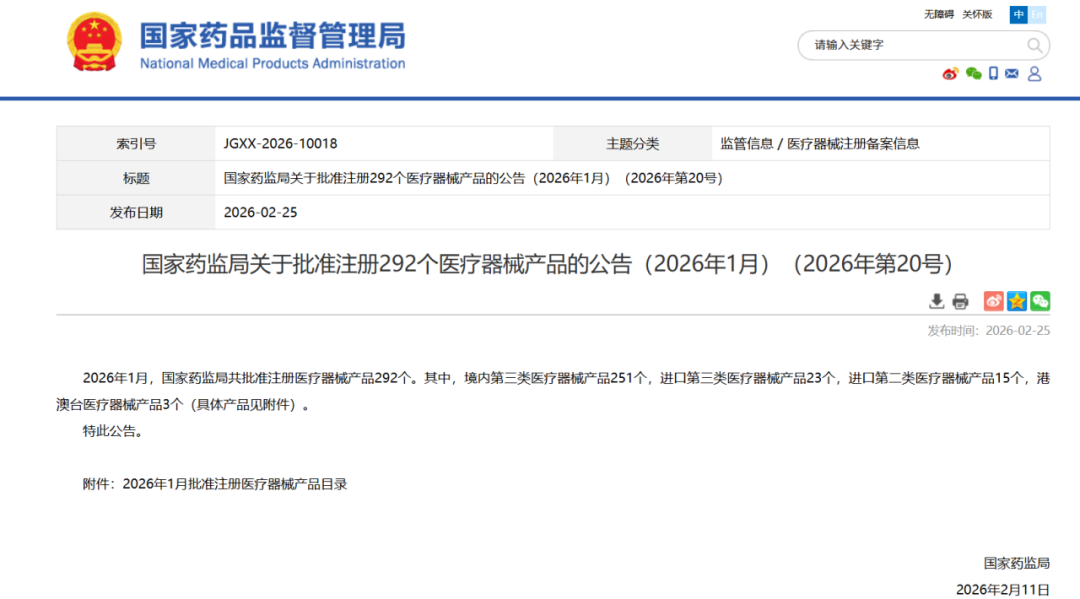 2026年1月,国家药监局共批准注册医疗器械产品292个。其中,境内第三类医疗器械产品251个,进口第三类医疗器械产品23个,进口第二类医疗器械产品15个,港澳台医疗器械产品3个(具体产品见附件)。其中,体外诊断产品47个。
