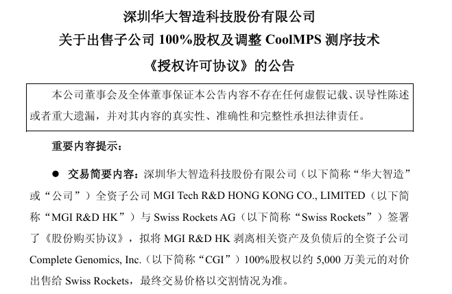 农历开工第一天,华大智造就发布重磅公告,宣布拟以约5000万美元的对价,将旗下美国子公司CGI100%股权转让给瑞士企业Swiss Rockets AG。从2013年华大集团以1.17亿美元收购CGI并由此孵化出华大智造。