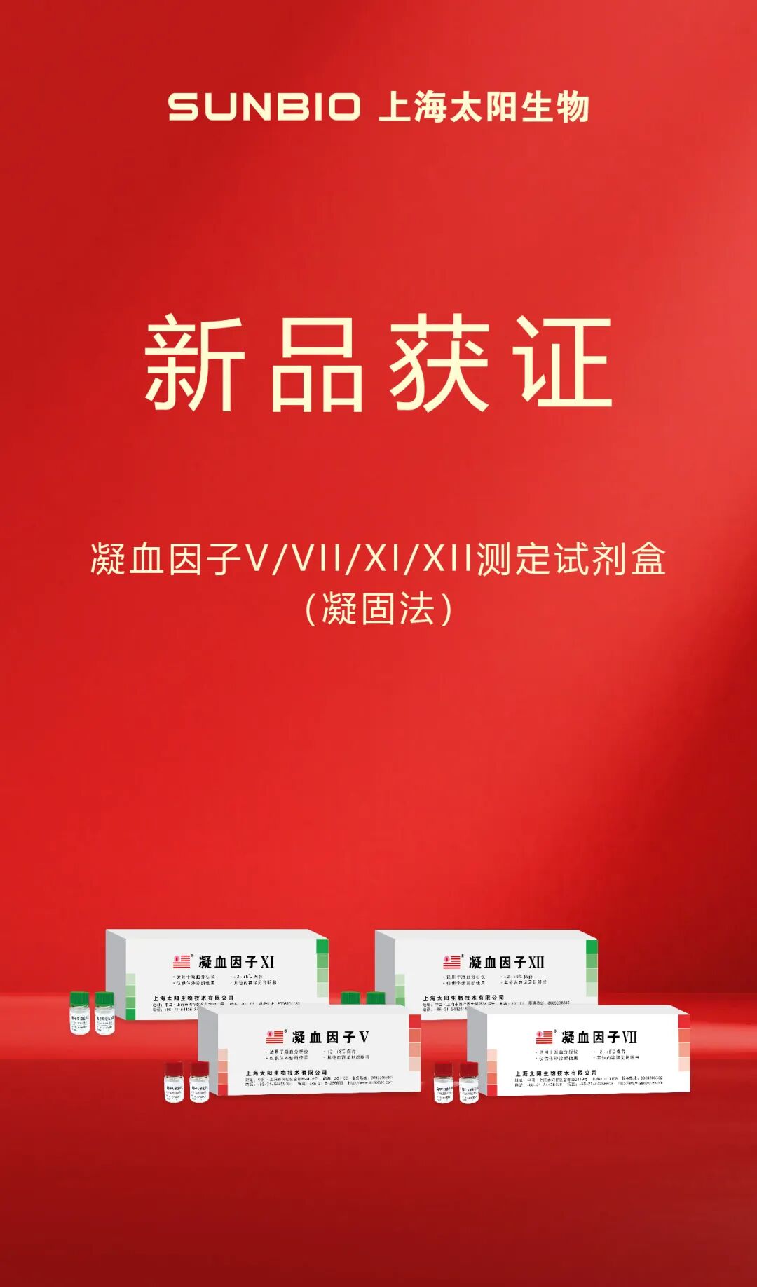 2026年2月25日,上海太阳生物自主研发的凝血因子Ⅴ、Ⅶ、Ⅺ、Ⅻ测定试剂盒(凝固法)正式获上海市药品监督管理局批准上市。获批新品临床上主要用于对凝血因子Ⅴ、Ⅶ、Ⅺ、Ⅻ缺乏或活性减低的诊断与治疗监测,产品不仅适配上海太阳生物全自动凝血分析仪,同时兼容希森美康、积水、思塔高、沃芬等品牌凝血分析仪。