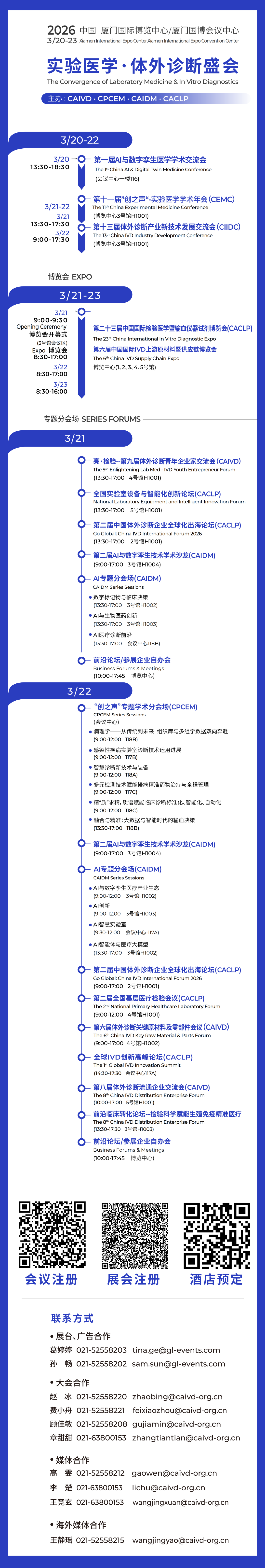 在全球体外诊断产业加速向高端化、智能化与多元应用拓展的背景下,标准化建设正与新材料突破、核心元器件技术升级及跨领域技术融合共同构成产业升级的关键支撑。行业创新已从终端产品延伸至上游基础层面,原材料性能优化、关键部件精密化以及系统协同能力提升,正成为决定检测产品质量稳定性与技术上限的重要因素。同时,细胞治疗等前沿生物技术的发展,也对上游材料与核心部件提出了更高标准和更复杂的技术需求。 作为体外诊断产业链的源头基础,关键原材料和零部件既关系到产品可靠性和一致性,也影响新技术落地和产业整体竞争力。加快标准体系完善、推动材料与器件技术创新、强化产业链协同,已成为行业实现高质量发展与自主能力提升的重要路径。 第六届体外诊断关键原材料及零部件会议将于2026年3月22日在厦门国际博览中心举行。会议将汇聚产业链各方力量,共同探讨如何夯实产业基础、推动关键技术突破,助力体外诊断产业在新一轮技术变革中实现持续升级与协同发展。 链通创新 诊领未来 时间与地点: 时间:2026年3月22日 9:30-17:00 地点:厦门国际博览中心4号馆 4-H1002 |