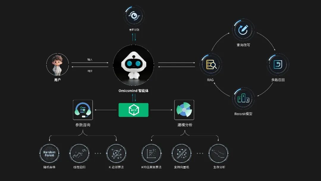 图:Omicsmind智能体以意图识别引擎为入口,精准理解用户的分析需求;通过 检索增强生成(RAG) 模块结合重排模型( Rerank ),为每个问题匹配最权威的生信知识背景;底层通过 MCP 协议统一调度参数咨询与建模分析两大核心功能模块,覆盖随机森林、线性回归等 20+ 种生信专属算法,将繁琐的建模流程压缩为一句自然语言指令。两大引擎协同配合,构建从"知识理解"到"模型输出"的完整分析闭环。