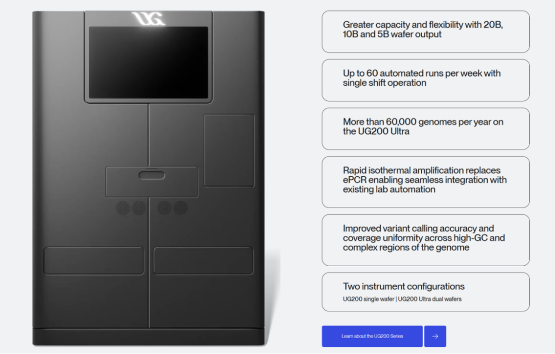 包含UG200(单片晶圆)和UG200 Ultra(双片晶圆)两种配置。该系列采用Solaris 2.0方案,取消了乳液PCR (ePCR) 步骤。核心能力包括:单片晶圆产出翻倍至200亿条reads(20B),UG200 Ultra每年可测序超过6万个人类全基因组,测序精度达SNV Q60。UG200起售价为85万美元,用户未来可通过现场升级将UG200转换为通量加倍的UG200 Ultra。
