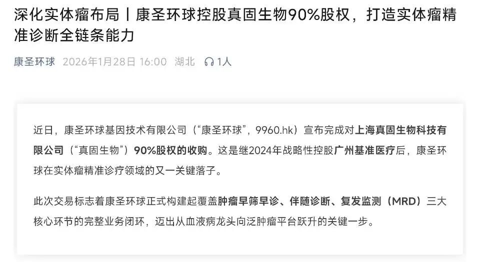 今年1月底,康圣环球宣布完成了对真固生物90%股权的收购。