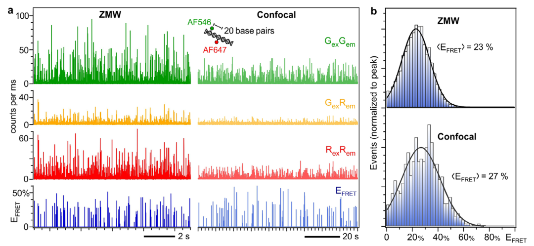 结果非常亮眼: 亮度激增:在最佳条件下(Alexa Fluor 647染料),单分子荧光亮度提升了 8.4倍!这意味着以前看不清的信号,现在变得清晰无比。 加速反应:分子的荧光寿命缩短了,意味着发光更快,科学家可以捕捉到更快的生物过程。 精准定量:在单分子FRET实验中,新方法得到的信号更集中(分布更窄),这意味着检测精度更高。