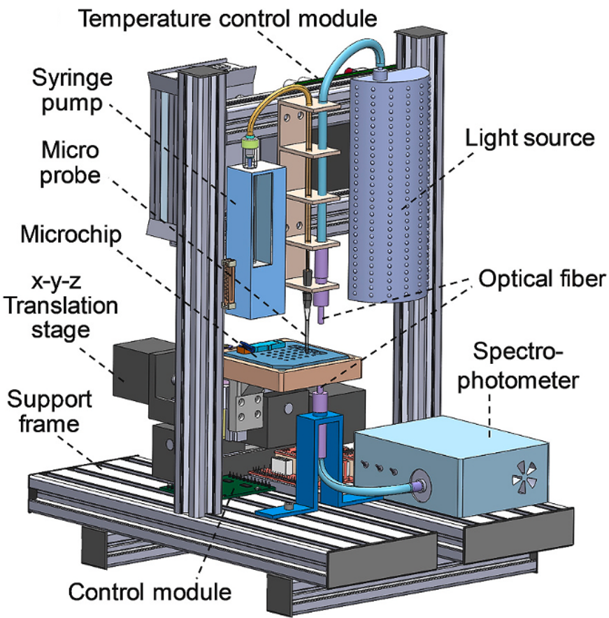 透射式光吸收微型生化分析系统如图 3 所示, 微量液体操控模块由注射泵和微探针构成,用于液体的量取和转移,温度孵育模块固定在工作台上,用于生化反应温度的控制;