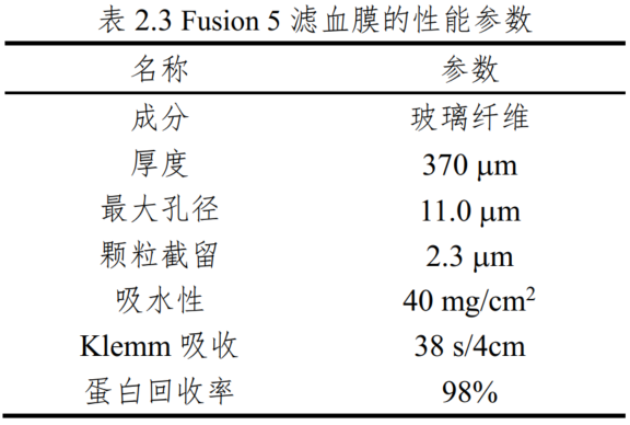 作者以滤血膜为血浆分离单元,膜内微孔隙截留全血中的血细胞的同时还可提供毛细驱动力。其中,滤膜选用 Fusion5,详细信息如图 6 所示。