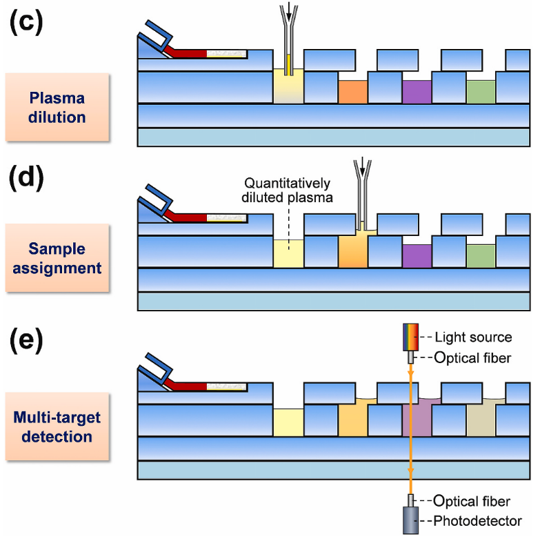 (c)  血浆稀释:微探针定位插入稀释池内, 泵出 5 μL 血浆与预先存储的 120 μL 稀释液混合。微探针内部多余的血浆泵出至废液池,然后自动转移至存储了纯净水的清洗池,反复 3 次抽打完成微探针清洗;