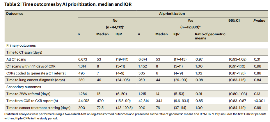本研究选择了两个主要终点,从胸片采集到CT检查的时间,以及从胸片采集到肺癌确诊的时间。此外还评估了若干次要终点,包括紧急疑似肺癌转诊数量、肺癌发病率与分期、从胸片到“2周内快速转诊”的时间、到治疗启动的时间,以及AI与人工报告之间的一致性和算法表现等。