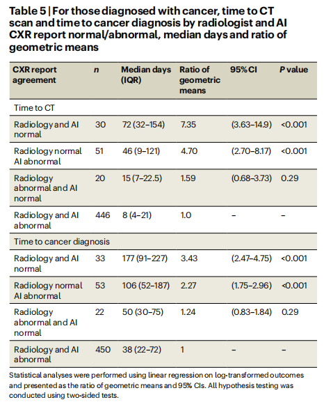 对于最终确诊肺癌的患者,作者按照人工报告与AI报告结果,比较了胸片到CT检测时间和胸片到癌症确诊的时间。结果显示,当人工和AI都判断异常时,患者胸片到CT检测的中位时间为8天,胸片到肺癌确诊的中位时间为38天;而当人工报告正常、但AI报告异常时,到肺癌确诊的中位时间延长至106天。若人工和AI都认为正常,到肺癌确诊的中位时间更高达177天(如下表)。这说明了AI在临床中有潜在价值,有机会帮助发现一些人工可能漏掉或低估的可疑胸片。