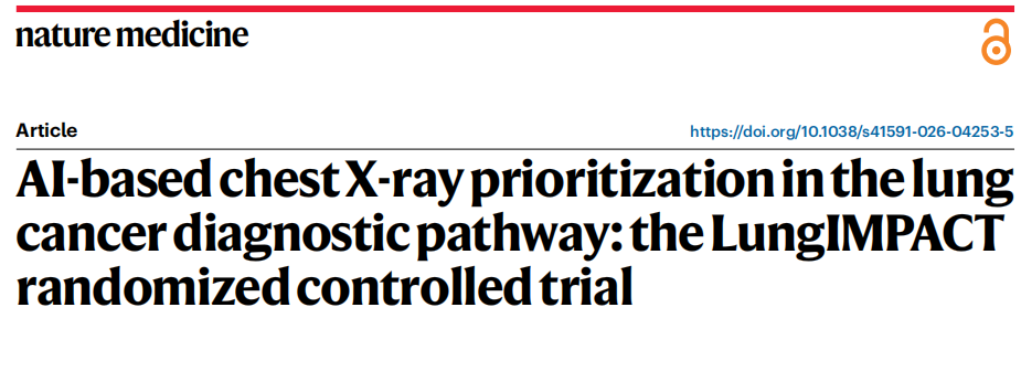 近日,来自英国多家医疗与学术机构的学者共同在杂志Nature medicine上发表了一篇题为“AI-based chest X-ray prioritization in the lung cancer diagnostic pathway: the LungIMPACT randomized controlled trial”的文章。这项前瞻性、多中心、随机对照试验显示,在英国真实世界场景中,仅靠AI对胸片进行优先级排序,并不能显著缩短肺癌诊断路径中的关键时间节点。虽然出报告更快了,但没有转化为更早的CT、更早的确诊。结果还表明,虽然AI优先排序没有改善总体路径效率,但AI在临床中有潜在机会帮助发现一些人工可能漏掉或低估的可疑胸片。
