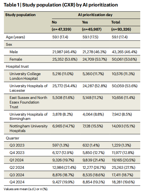 研究团队进行了一项前瞻性、多中心、随机对照研究,于2023年7月至2024年12月在英国5家NHS医疗机构开展,共进行了 97731 次胸部 X 光检查。 最终,93326 张胸片结果被纳入研究分析,其中45987张胸片(49.3%)由AI参与了即时优先级排序。整个研究中共识别到13347次CT检查,其中2766次发生在胸片后14天内;最终共有558人被诊断为肺癌,约占全部胸片的0.6%。研究人群平均年龄59岁,男性约占46%。
