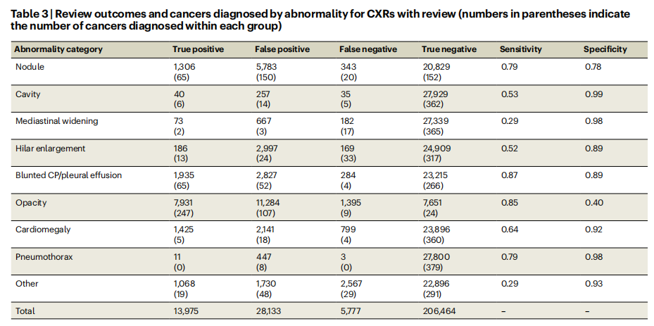 专家复核结果显示,其中6750例存在“可操作性发现”,约占复核病例的23.9%。总共 254349 次不一致发现审查,其中 5.5% 为真阳性,11.6% 为假阳性,2.3% 为假阴性,81.2% 为真阴性。如下表所示,AI对不同征象的表现差异较大。比如对于opacity(片状/实变样阴影),AI灵敏度较高,为0.85,但特异度仅0.40,意味着假阳性较多;而对于结节(nodule),灵敏度和特异度分别为0.79和0.78,表现相对均衡。