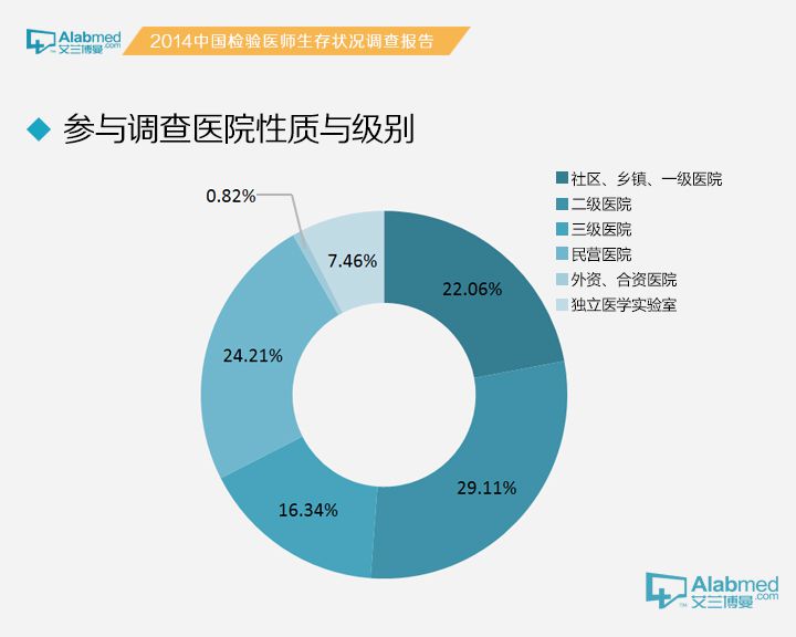 社区/乡镇卫生服务中心/一级医院22.06%、二级医院29.11%、三级医院16.34%、民营医院24.21%、外企/合资医院0.82%、独立医学实验室7.46%;