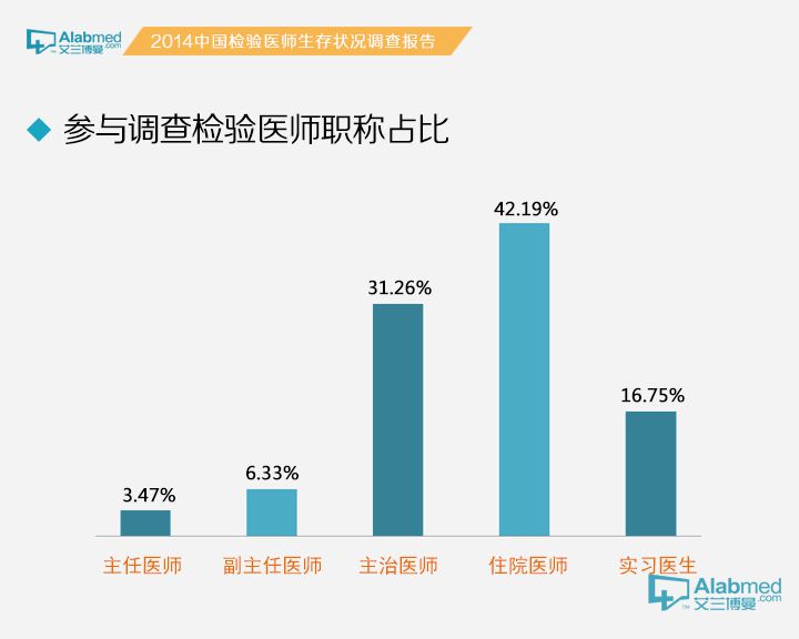 主任医师/主任技师3.47%、副主任医师/副主任技师6.33%、主治医师/主管检验技师31.26%、住院医师/技师42.19%、实习医生/实习技师16.75%;