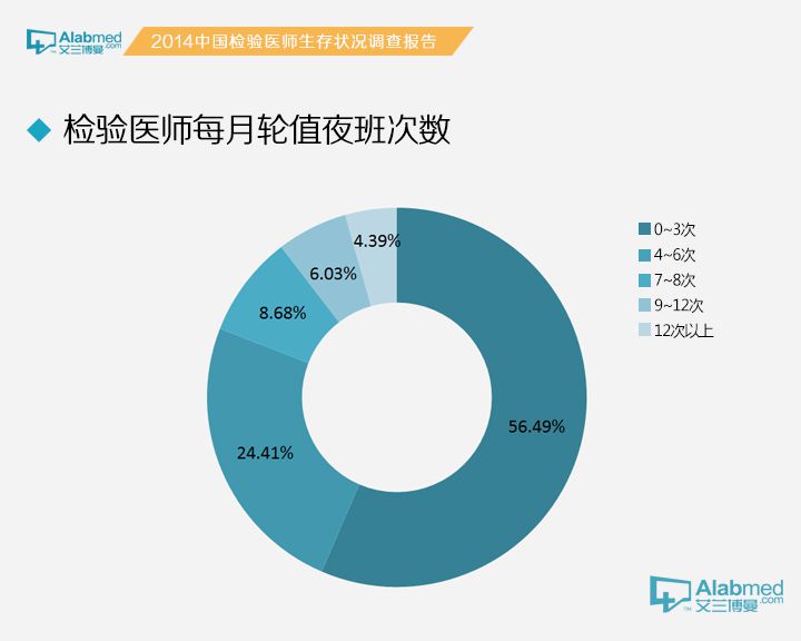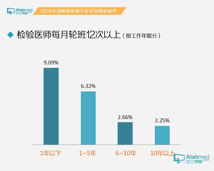 关于值夜班的次数 每月值夜班0~3次的检验医生占56.49%,4~6次的占24.41%,7~8次、9~12次、12次以上的分别占8.68%、6.03%、4.39%。其中,45岁及以上检验医生每月值夜班≤3次者达83.75%,远高于其他年龄段;独立医学实验室检验医生每月值夜班≥12次者达21.92%,远高于其他性质单位;实习医生/实习技师每月值夜班≥12次者达10.37%,远高于其他职称的医生;工作经验1年以下的检验医生每月值夜班≥12次者达9.09%,远高于其他工作年限的医生。